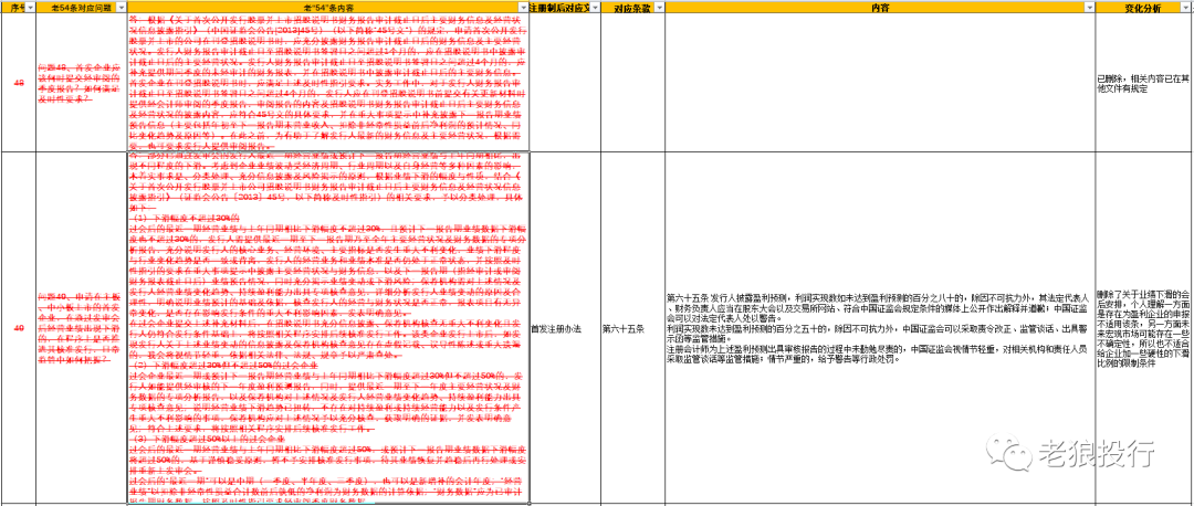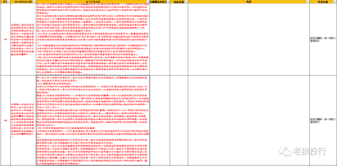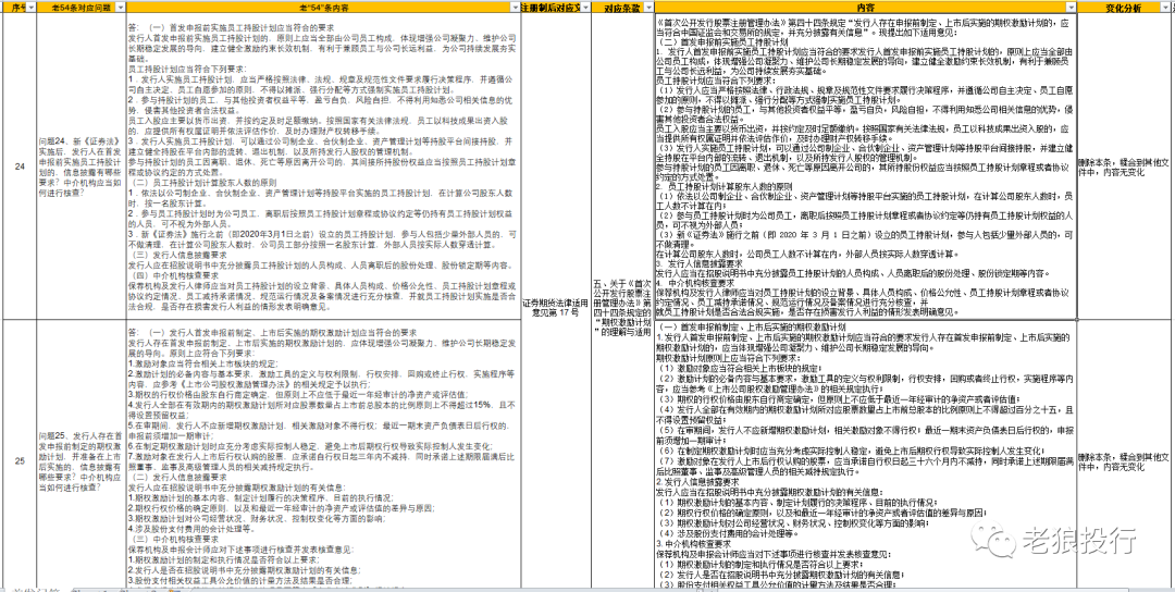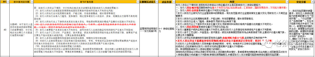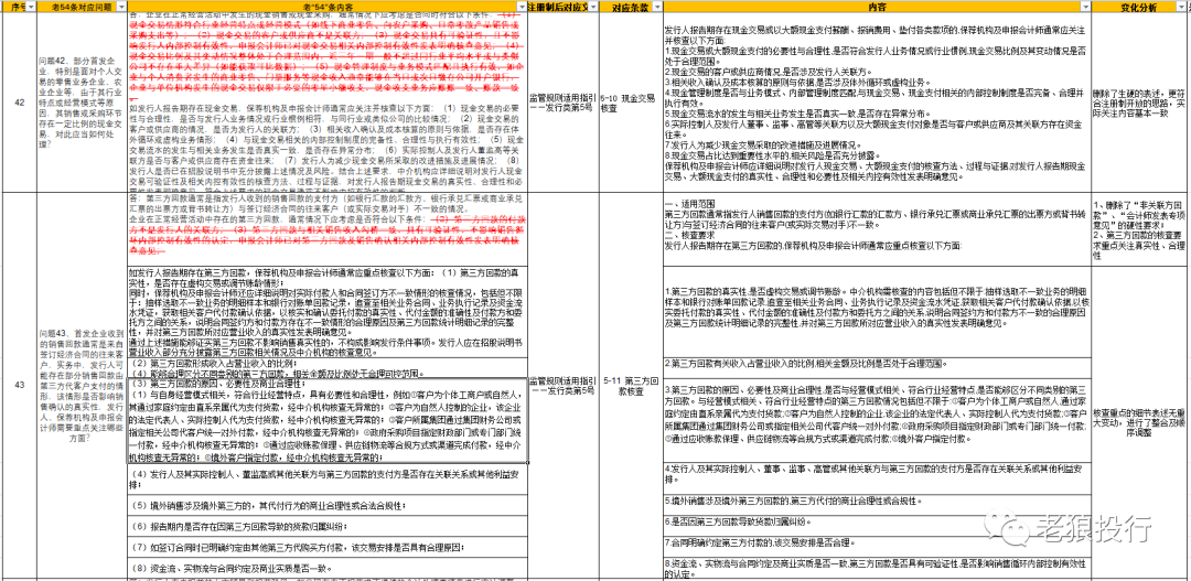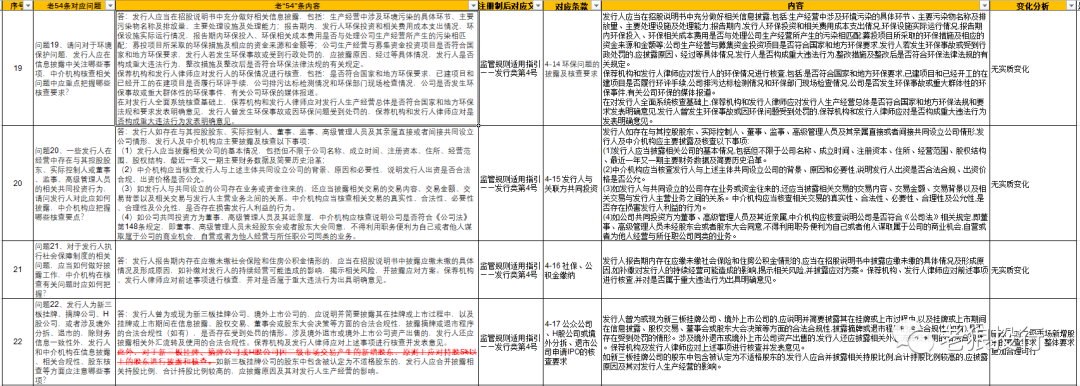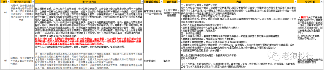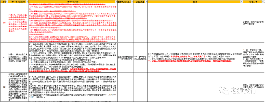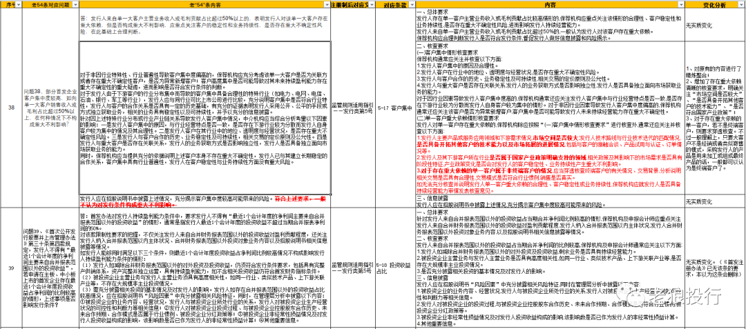 【前言】对投行从业者来说,老“54”条实在太过深入人心,非常有必要以老“54”条为准绳,逐条对比其中的差异,并将简化及删除的内容具体糅合到其他文件的出处也做个详细地阐述。本次修订,也体现了一些目前的审核重点: (1)紧跟注册制强调信息披露、强调针对性和重要性原则的原则,三大板块的规则进行了更新整合,部分较老的监管问答进行了与时俱进的修订; (2)整体的内容较原先进行了精简,部分简单重复或会计准则规定较为明确的简单问答内容进行了删除,如原问答27关于建筑企业工程施工的问题、问答29关于存货减值的问题等;部分已有相关文件规定的内容也进行了删除,如问题36关于主营业务3年内未变更的要求,实质已在《证券期货法律适用意见第3号》中进行了规定; (3)细化了经销业务核查的具体要求,新增的文字篇幅较大; (4)对一些财务处理实务中不够明确的问题进行了细化,比如股份支付的确认、等待期问题等。希望作者此文能对各位看官有所助益,不胜欢喜。 |