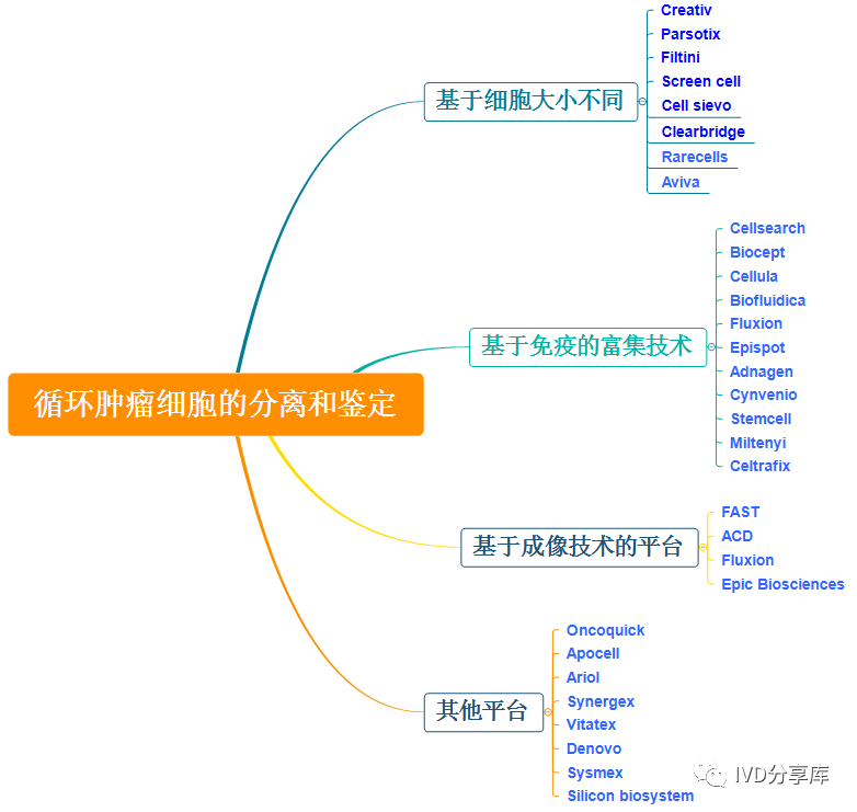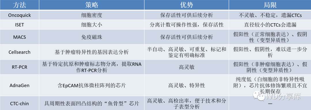 循环肿瘤细胞是外周血中所有肿瘤细胞的统称,因自发或者诊疗手段从实体瘤肿瘤病灶(原发灶、转移灶)脱落进入外周血循环。大量临床研究表明,对CTC数量进行跟踪、监控有助于癌症早期诊断,预后判断和药效评估。ctDNA是肿瘤细胞体细胞DNA经脱落或者当细胞凋亡后释放进入循环系统,是特征性的肿瘤生物标志物。循环肿瘤DNA检测技术近年来正逐渐成为国际上具有重大潜力的肿瘤诊断新技术。 研究者很早便在肿瘤患者的血液中检测到CTCs,并且发现在肿瘤发生早期即有循环肿瘤细胞通过血液循环发生全身扩散的现象,开启了研究热潮。1948年,科学家便在人类血液中检测到cfDNA的存在,但是早期并未受到较多重视。然而,早期的研究以基础研究为主,很少有对应的专利布局。 1977年,科学家发现肿瘤患者外周血中存在较高水平的cfDNA,其后肿瘤患者血液循环中的cfDNA受到了研究重视。ctDNA是坏死或凋亡的肿瘤细胞释放到外周血中的肿瘤DNA片段,被包含于cfDNA中,是肿瘤患者cfDNA中的一部分。 近年来,ctDNA的相关检测技术受到了重视,其重点是针对主要瓶颈加以开发:一是ctDNA在血液中的浓度低;二是ctDNA易被其他更高浓度的循环DNA干扰;三是肿瘤细胞的基因变异(包括点突变、删除、插入、扩增、DNA修饰等)信息复杂,已知信息不全面,从而使得检测的灵敏度及准确率受到限制。在此情形下,针对ctDNA的富集成为专利布局的重点,包括用于稳定循环肿瘤细胞的组合物(CA2917912)、循环肿瘤细胞分析中假阳性识别(WO2015161231)、用于检测和分离循环肿瘤细胞磁性纳米结构(US20180059114)等。 同时,许多用于CTCs的检测技术得到了开发,例如密度梯度分离技术、基于尺寸的过滤技术、基于免疫的分离技术、免疫磁分离技术(CN107858144)等,通过细胞的物理性质(例如大小、密度、电荷、变形性等)(JP6535050、US20110294206)或生物特性将其与正常细胞分开。 以CTC、cfDNA、外泌体等肿瘤液体活检,被列为2015年十大突破技术之一,进一步加速了专利布局的热潮。就循环肿瘤细胞的分析技术而言,肿瘤分子标志物的检测是基础的方法,但是CTC单细胞基因组测序能够读取单个循环肿瘤细胞特异性信息,发展潜力巨大。对于异质性很强的肿瘤,CTC相比组织单一取材,更能全面反映肿瘤组织的异质性,更适合于评估肿瘤的分子特征及评估肿瘤进展。因此,一些特定的标志物相关专利得到了布局(例如US10234447、EP2529030等)。常见的循环肿瘤细胞分子标志物及其检测应用如下图1所示。 图1、常见的循环肿瘤细胞分子标志物及其检测应用(来源:IVD分享库) 综合专利分析表明,全球有诸多的专利权人布局循环肿瘤细胞的分离和鉴定,这些布局基于不同的原理加以开发:①基于细胞大小不同,如英国ANGLE公司开发的名为Parsortix的新型细胞捕获技术;②基于免疫的富集技术,如美国强生公司开发的计数分析循环肿瘤细胞Cell Search系统,其是全球第一个经过FDA(2004年获批)和原国家食品药品监督管理总局(2012年获批)批准用于恶性肿瘤疾病管理的检测循环肿瘤细胞的商业化产品;③基于成像技术的平台,如不需要富集的FASTcell,利用光纤扫描,优点是减少曝光时间,因为它使用了激光光源和光电倍增管检测器。不过,缺点是高速成像有可能降低分辨率。分辨率较低会影响准确性,因此需要通过显微镜来确认;④其他平台,如基于细胞介电性质的双向电泳技术,目前商业化的双向电泳技术主要有ApoCell公司的ApoStream、SiliconBiosystems公司的DEPArray。 图2、循环肿瘤细胞分离和鉴定的专利权人技术分类(来源:IVD分享库)常见的循环肿瘤细胞分离方法及其优缺点如图3所示。从专利发展历程和布局现状来看,循环肿瘤基因检测技术专利在以下方向呈现出发展的新空间。 图3、常见的循环肿瘤细胞分离方法及其优缺点(来源:IVD分享库)血液中循环肿瘤细胞含量极低,如何富集成为关键技术。在加速循环肿瘤基因在临床实践中的应用,结合富集和检测技术的自动化检测系统已被用于提高检测的灵敏度和特异性。例如,采用纳米级免疫磁性平台,或可用于快速、高效捕获以及温和释放循环肿瘤细胞。就目前的循环肿瘤细胞的捕获和分离技术而言,细胞表面标志物有很多种,如根据标志物类型来分,有上皮细胞标志物(上皮细胞黏附因子和细胞角蛋白)、器官特异性标志物、上皮细胞转化(EMT)标志物;根据抗体类型来分,有单一抗体、“鸡尾酒”、复合物(抗体-多核酸复合物、生物素标记的抗体、氨基化树状分子);根据策略类型来分,有免疫磁珠、免疫细胞化学、微流控等(如图4所示)。 图4、循环肿瘤细胞的捕获和分离技术原理分类(来源:IVD分享库)尽管基于上皮细胞标志物的捕获技术仍然是“金标准”,但是很难找到灵敏性和特异性兼顾的生物标志物,因而假阳性和假阴性的局限仍然难以避免。可能用于循环肿瘤细胞检测的常见分子标志物如图5所示。 图5、可能用于循环肿瘤细胞检测的常见分子标志物(来源:IVD分享库)存在于血清、血浆、尿液、胸腹水、脑脊液等体液中的循环肿瘤RNA(circulating cell-free RNA, cfRNA),也已逐渐成为新兴的液体活检分子标记。与传统分子诊断技术相比,基于cfRNA的液体活检能够克服肿瘤的异质性,更全面地反映肿瘤特性,并具有非侵入性,便于多次取样,可对患者进行实时监控。目前在基因融合突变检测中常用的染色体显带技术、荧光原位杂交、