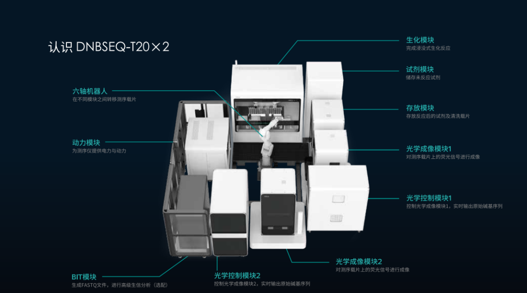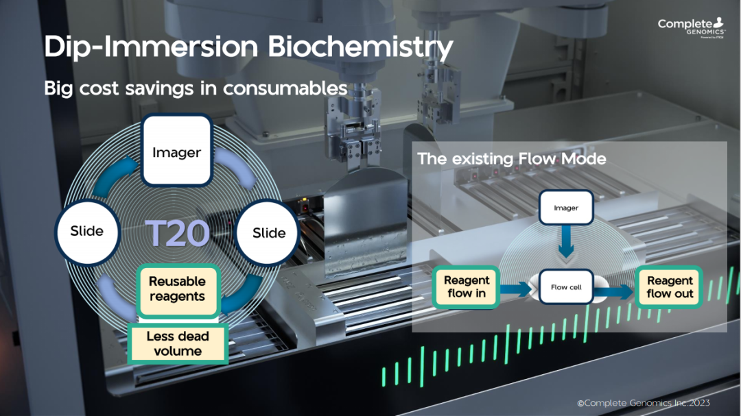 测序仪被称为基因测序产业链上的珍珠,其技术革新推动着人类基因组测序通量的提高和成本的下降,但技术革新从来不是一蹴而就。最初,科学家们设想能够在一张载片上分析超过十亿个扩增后的DNA片段,通过大规模并行的反应和信号检测减少试剂耗材的消耗,降低成本。2015年,第一款基于该设想的机型,即华大智造美国子公司Complete Genomics发布的Revolocity超高通量测序仪平台一年可完成1万例个人全基因组测序(hWGS,human Whole Genome Sequencing)。现在,一台T20每年可完成5万例hWGS,成为目前世界上通量最高的低成本可量产测序仪。这背后凝聚了众多技术的革新,《测序中国》特邀华大智造高级副总裁倪鸣博士为大家一一揭秘。 T20的“第一眼”印象 图1:DNBSEQ-T20×2主要模块构成。 来源:参考资料[1] 首先,我们可以直观地了解一下T20的组成,主要包括试剂模块、生化模块、光学模块(×2)、动力模块、BIT模块(选配)等。与大多数测序平台的组成相比,T20并没有太大出入,但T20打破了封闭式生化液路系统的传统构造,采用开放式系统和模块化结构。拥有一套这样的设备,就相当于拥有了一座“测序工厂”。 其次,在生化原理技术路线的选择上,T20创新性地采用了浸没式的生化反应系统(下文将进行详细介绍),极大地提高了测序效率和测序规模、并进一步降低了测序成本。 当前,T20可以同时支持6张超大尺寸的测序载片上机运行,每张测序载片不仅能够独立运行不同的测序读长和测序应用,还能够支持不同文库的混合测序。T20的整个测序全流程通过2个四轴机械臂和1个六轴机器人实现了自动化串联,单次通量是目前其他超高通量测序平台的4.5倍~10.5倍之高(PE100,42Tb/Run;PE150,72Tb/Run)。 “将耗材成本降到极致” 生化模块:实现T20测序成本降低的重要拼图 T20的生化模块采用了浸没式生化反应技术。该技术的应用可以大大降低单位数据产出所消耗的测序试剂,提高试剂利用率,从而进一步降低单位数据测序成本。倪鸣博士感慨道:“可以说,T20正是通过浸没式生化反应技术实现了测序读长、测序通量、数据质量以及成本投入之间的最佳平衡。” 图2:浸没式(左)和流道式(右)生化平台流程图。 来源:华大智造 测序仪采用的流道式生化反应依赖于复杂的流体和升降温控制系统,这种“样本固定、试剂流动”的生化反应方案对流动槽的加工工艺有着较高的要求,包括流动槽的平整度、在升降温过程中的形变程度、流体高精度控制等。如果固定在芯片平台上的流动槽平整度不够或在升降温过程中变形过度,将直接影响生化反应的均匀性、充分性以及后续光学系统的信号采集。而复杂的流体和温控系统也意味着较高的硬件和维修成本。此外,流道式生化反应方案中的反应试剂均为一次性使用,试剂有效成分利用率极低也限制测序耗材成本的下降。 与之相反,华大智造独创的浸没式生化反应采用了“试剂固定、样本转移”的方案,将无表面覆盖的测序载片依次浸泡在可控温的反应槽中以完成特定的生化反应,试剂槽温度控制可以精密到±0.5摄氏度内,保证生化反应的稳定性。这种浸没式的“无表面覆盖测序载片”避免了传统流动槽试剂流速不均匀的问题,测序载片表面不易产生气泡,生化反应更均匀、充分,载片的利用率进一步提高,且整张浸入反应试剂中的测序载片受热均匀,也不易发生形变等。 倪鸣博士谈道:“浸没式生化反应技术最大的优势在于可以通过在同一反应槽依次浸泡多张测序载片,完成多个测序循环。我们采用自主研制的试剂配方,能够在不发生交叉污染的前提下实现测序试剂的重复利用,大大提高了试剂利用率与数据生产效率,增加了数据产量,降低了测序成本。” 图3:浸没式(左)和流道式(右)生化反应示意图。 来源:参考资料[2] “将技术优势发挥到极致” “将算法精度提升到极致” 测序算法:匹配T20超强生产规模的数据处理和碱基识别能力 由于单位时间内捕获到的超大量荧光信号,需要准确、快速、实时转化成原始碱基序列信息,对获取到的图像的实时处理、信号转换以及数据传输也提出了更高要求。为了提高数据质量,最大限度缩短数据处理时间,T20引入了硬件计算加速,突破传统CPU架构计算能力和吞吐量的瓶颈,获得了上百倍数据处理能力的提升。 倪鸣博士强调,针对TDI线扫成像的特点,T20研发团队提出了非对称的点光源亮度提取算法。随着测序进程的推进,该算法会综合参考过程参数进行动态调整,显著提高了准确率,同时采用了传统图像处理方法和深度神经网络相结合的方式,能够极大地提高碱基识别算法的精度和适用性。 “将配套保障做到极致” 进一步地,为了满足大人群基因组项目、尤其是百万级别国家基因组项目快速启动的需求,以T20为中心,华大智造提供可选的一站式工具包,包括样本制备系统(MGISTP-7000和MGISP-NE384)及试剂、自动化建库设备(MGISP-960和 MGISP-Smart 8)、建库试剂,以及一系列支撑海量数据处理的工具和模块,例如:具备Pb级数据存储和生信分析加速处理能力的ZTRON Pro一体机,以及可实现样本管理、实验室生产、基因数据管理的ZLIMS Pro+等。 其中,华大智造ZTRON Pro一体机是针对高通量测序仪设计的集实验室信息管理、生信计算和海量基因数据存储为一体的基因数据平台,可以在实验室中直接使用,也可部署于传统的数据中心,满足高达百万级规模的测序