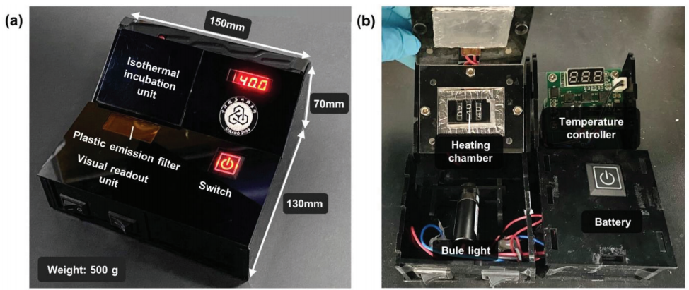 传染病大流行对全球医疗系统构成了巨大挑战。快速准确的诊断测试是有效防止病毒传播的关键。此外,致癌感染是一种重要的、潜在可预防的致癌因素。感染引发的癌症占全球所有癌症病例的1/6以上,对低资源环境中的人们造成了不成比例的影响。 尽管实验室中的精密诊断仪器可以提供高度灵敏、选择性和可重复的检测,但它们通常只在大城市的医院提供,而在许多缺乏必要基础设施的发展中国家无法使用。POCT是实验室测试的简化版本,近年来作为一种测试趋势迅速发展。该技术旨在在患者的护理场所或附近进行诊断分析,消除了对复杂实验室样本处理的需要,并快速获得测试结果。因此,它们可以被送到各种初级卫生服务设施和低资源地区,以扩大人口覆盖范围。核酸检测能够以高灵敏度和特异性检测微生物的核酸,在诊断各种病原体中发挥着重要作用。常规聚合酶链式反应(PCR)需要复杂的温度控制,不适合现场测试。等温核酸扩增,如RPA和环介导等温扩增(LAMP),是POCT分子诊断的有力方法,因为它们只需要恒温加热器,如水浴或加热块,而不需要热循环仪。RPA反应接近常温(37–42°C),快速高效,通常只需20分钟即可产生肉眼可分辨的结果。它有可能在POCT开发中实现便携式、高灵敏度以及多路检测。 已经开发了用于资源有限环境的各种核酸检测。例如,Jonathan Cooper小组开发了一种基于纸张的POCT设备,用于在40分钟内通过逆转录酶LAMP(RT-LAMP)进行病原体检测。然而,诸如非整合核酸提取、开放检测系统增加交叉污染风险、对昂贵设备(即移液管、商用加热器、离心机、LED透照器等)和基础设施(即交流电源)的依赖性等问题严重限制了POCT的应用,尤其是现场测试。 近日,一组来自中国的研究团队在杂志Advanced Science上发表了一篇题为“Portable Paper-Based Nucleic Acid Enrichment for Field Testing”的文章。在文章中,研究团队描述了一种简单的便携式快速感染病原体的检测平台,包括SARS-CoV-2和幽门螺旋杆菌。在一个典型的on-site测试设置中,样品到结果的周转时间短于30分钟。结果可以用肉眼读取,也可以通过智能手机应用程序进行分析。该平台是灵活的,可以在一次测试中检测多种病原体。该平台为任何地方的传染源检测提供了一种快速、准确和方便的方法。 图片来源:Advanced Science POCT平台的设计和运行 POCT平台的工作流中有四个主要步骤(如下图)。 (1) 样品收集和室温下裂解。 (2) 纸基核酸富集。将溶解的样品装入纸基富集芯片,并通过横向流动将核酸提取到结合盘(binding disc),然后用无水乙醇洗涤结合盘以快速除去残余水。 (3) RPA反应。将预安装管中的结合盘、引物、探针和RPA试剂加载到扩增芯片上,进行one-pot反应。芯片用粘土密封,并在40°C的电池供电便携式读取器中孵育20分钟。 (4) 结果读数。将芯片取出并放置在检测室中,并在488nm蓝光激发下观察。阳性对照显示亮绿色荧光,而阴性对照保持无色(或非常浅绿色荧光)。荧光结果可以直接从便携式读取器中可视化,并通过智能手机应用程序进一步分析。 POCT平台的工作流。图片来源:Advanced Science 核酸富集 研究团队设计了一种新型的基于纸张的核酸富集芯片,用于快速提取DNA/RNA。芯片上浓缩的核心是一个直径1.5 mm的纸装圆盘(图a)。将室温下使用裂解缓冲液裂解的100µL样品体积添加到样品装载区域,并通过毛细管作用穿过结合盘,核酸被捕获在结合盘上。干燥后的核酸结合盘,被直接用作RPA反应的扩增底物。在30分钟内,使用此纸基富集方法从核酸浓度低至100拷贝/毫升的样品中检测到荧光扩增信号。此纸基富集方法比普通FTA卡提取方法敏感100倍(图d)。一种可能的解释是,样品中更多的靶核酸被捕获在结合盘中,而扩增抑制剂通过侧向流被洗掉。 纸基的核酸富集方法。图片来源:Advanced Science 病原体的常温裂解 样品预处理的另一个关键问题是裂解。与纸基核酸富集相结合需要一种不加热的快速和室温裂解方法。研究团队在室温下测试了一些常见的裂解缓冲液(如Trizol、RIPA、NP-40和TritonX-100),以检测人造细菌或病毒样本。结果表明,Trizol和RIPA对人造病毒样品均表现良好,RIPA和NP-40对人造细菌样品均表现出色。 还通过实验验证了一个1.5毫米直径的结合盘足以进行核酸富集(图e,f)。此外还优化了用于富集的适当样品体积。结果显示,在1.5 mm结合盘上富集的100µL裂解样品的体积足以在8分钟的富集时间内获得满意的扩增(图g)。 纸基的样品预处理。图片来源:Advanced Science 便携式读取器的结构 研究团队设计并制造了一个可充电便携式读取器,用于恒温加热和终点荧光输出(图a,b)。便携式阅读器小巧轻便(15厘米×13厘米×7厘米,重量仅500克)。使用一对可充电锂电池,一次充电可使其运行8-9小时,并支持至少24批测试。实验室制造成本低于30美元,并且便携式读取器在每次使用后不需要更换或清洁。 恒温培养单元、视觉读出单元、温度控制器和双18650电池集成到电池供电的便携式读取器中。等温培养单元主要是两个加热垫,设置在加热室底部和盖子上,用于扩增芯片的加热。视觉读出单元是488nm蓝光和塑料发射滤光片。 POCT平台的结构。图片来源:Advanced Science one-pot检测 芯片上采用one-pot扩增,整个反应在密封系统中进行,无需打开盖子,可以有效避免环境气溶胶污染导至的假阳性结果。为了在芯片上快速完成RPA,需要解决两个主要