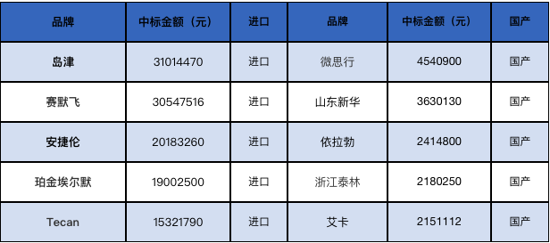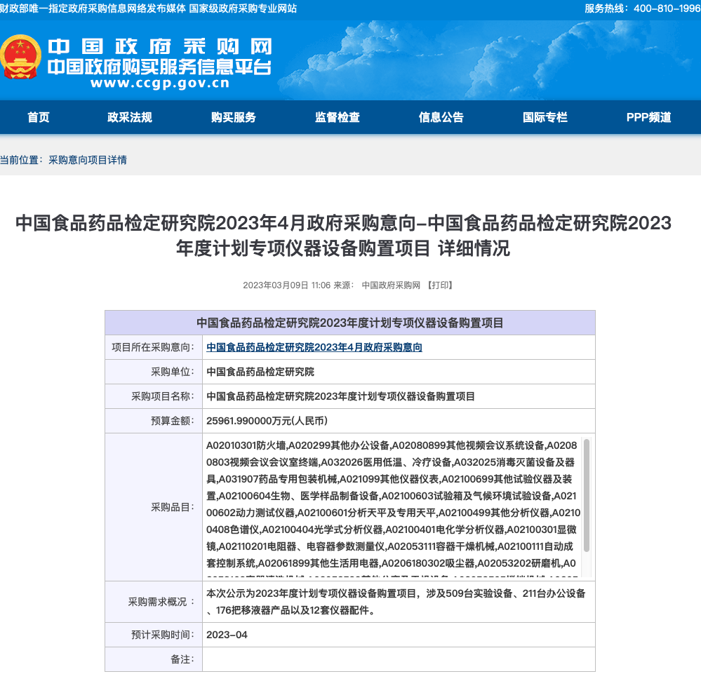 “采购大户”中检院又发大宗意向,超过2.5亿元采购需求都要购买哪些仪器? 中检院一直是仪器设备的采购大户。 从公布的中标信息看,2021年中检院共进行仪器采购相关招标13次,主要集中在年中进行,全年采购各类仪器近900台套,金额近4亿人民币。 在900多项采购中,仪器单价在100万以上的仪器共有91个,包括色谱、质谱、扫描电镜、电子探针、流式细胞仪、数字PCR等多种仪器。其中单价最高的前10个仪器中,各类质谱6台,其中2台离子淌度质谱价值最高。 从采购结果上看,共有约170个品牌中标。 进口品牌中,岛津、赛默飞、安捷伦、珀金埃尔默、Tecan、艾本德、梅特勒、伯乐、沃特世等中标金额名列前茅。而在国产品牌中,微思行、山东新华、依拉勃、浙江泰林、艾卡、中德华为、青岛海尔、艾普拜生物等中标金额较多。 2021年中标品牌金额TOP5 2023年采购意向 2023年3月9日上午11点,中国食品药品检定研究院在中国政府采购网发布了《中国食品药品检定研究院2023年度计划专项仪器设备购置项目》。 意向总预算25961.99万元(人民币),预计采购时间2023年4月。 中国政府采购网截图 本次公示为2023年度计划专项仪器设备购置项目,涉及509台实验设备、211台办公设备、176把移液器产品以及12套仪器配件。 采购品目: 本次采购是否会有更多国产仪器中标,我们共同期待。 |