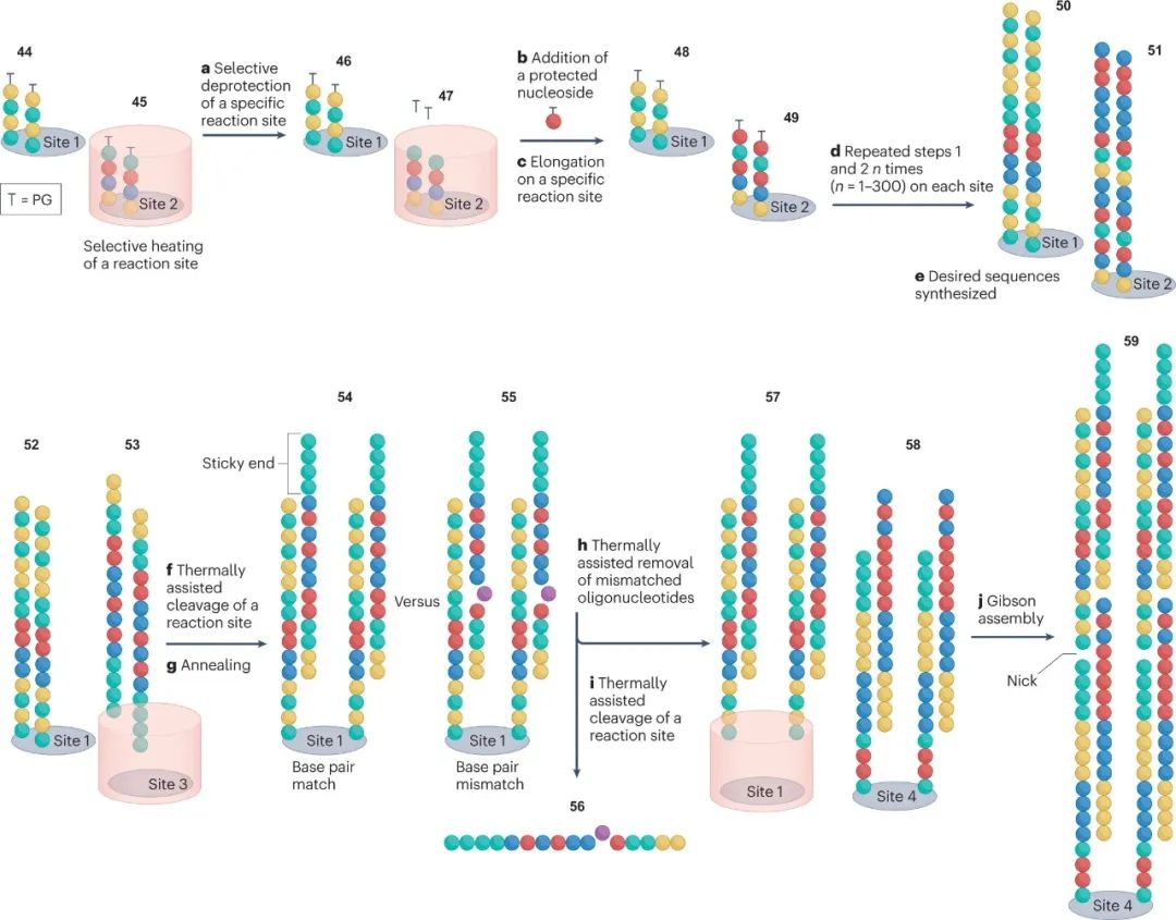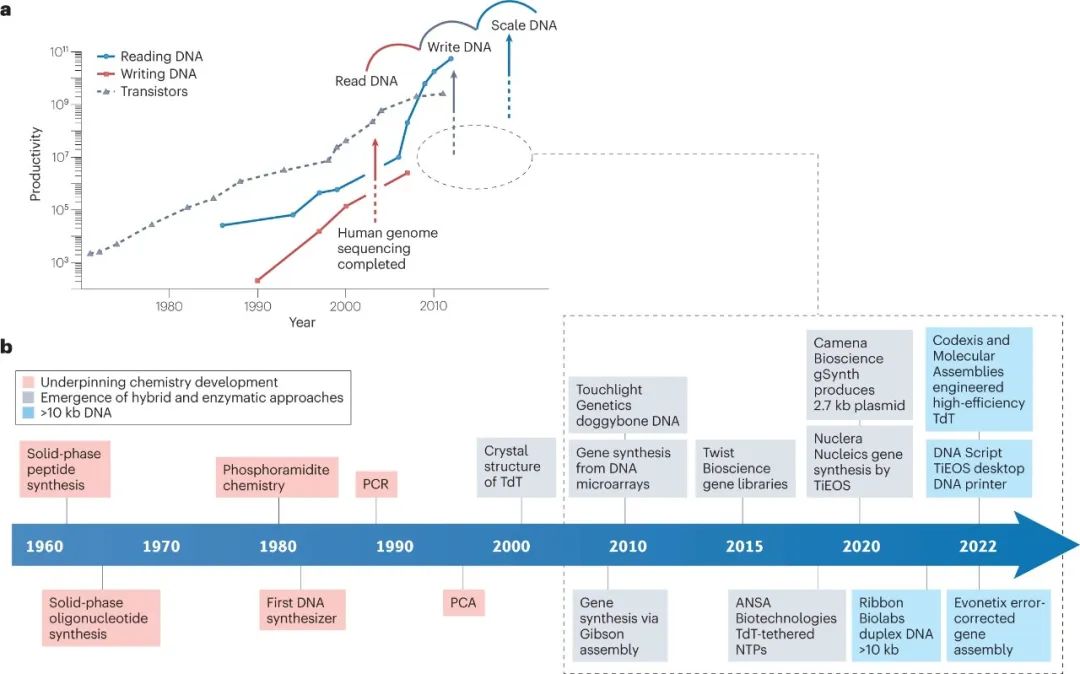 许多研究和商业活动部门对合成 DNA 的需求不断增加。如果能够大规模并低成本地提供 DNA,工程生物学、治疗、数据存储和纳米技术将能获得快速发展。受到下一代测序和基因编辑技术成功的刺激,DNA 合成已经成为一个新兴行业。然而,>200 bp 序列的合成仍然负担不起。为了克服这些限制并开始像读取 DNA 一样有效地编写 DNA,已经开发了替代技术,包括分子组装和克隆方法、模板非依赖性酶促合成、微阵列和滚环扩增技术。 DNA是生命的信息库。自发现以来,它已成为化学、生物学和材料科学的重要研究工具。在过去的二十年中,我们在从合成基因组生成包括活体微生物在内的生物系统方面取得了显着进步。这一成功的结果是,对 DNA 的需求不断增加,推动了新技术的发展,以提供更高纯度、更高数量和更低成本的 DNA。这些要求已将商业重点转向提供合成 DNA,而不是从天然来源分离 DNA。 逐个核苷酸顺序合成多核苷酸的能力允许控制 DNA 的组成和大小。合成 DNA 序列为研究人员提供了一种多功能工具来探测生命系统,而不是依赖于从生物体中分离出的自然序列。此外,对于某些应用,例如扩增无法访问的序列,合成 DNA 便成为唯一可行的选择。DNA 合成技术的发展也可能与材料科学和纳米技术相关,例如,在 DNA 折纸中,使用非天然核苷酸或非天然骨架(例如异种核酸xeno nucleic acids(XNAs))创建新型 DNA 结构和功能。 同样,同聚多核苷酸、共同嵌段和任意多核苷酸的合成不断发展,比如在单链 DNA 作为纳米级设备或基因组工程的支架或供体材料的应用中。 下一代测序 (NGS) 的创新改进了 DNA 的读取和编辑并彻底改变了细胞和群体基因组分析,这些分析现在已应用于“大型基因组”计划。DNA可以被大规模和低成本地进行分析。然而,缺乏大规模的 DNA 合成仍然是技术进步和基因组结构和细胞功能的大规模分析的障碍。这一障碍凸显了发达的读取 DNA、识别和测序基因组的能力与欠发达的编写 DNA 以及合成和产生无限长度和复杂性的 DNA 序列的能力之间存在的差距。 在当前 DNA 合成商业化的环境下,企业要么提供他们自己合成的 DNA,要么提供即用型自动合成仪器,供研究人员在自己的实验室中制造 DNA。这两种途径都使那些缺乏专业合成技能并因此缺乏 DNA 合成“低技能”的最终用户可以进行 DNA 合成。然而,通过去技能化广泛获取合成 DNA 可能会导至合成 DNA 的滥用,这就需要进行监管以减轻滥用造成的潜在危害。 在这里,我们回顾了现有的和新兴的 DNA 合成技术,重点是工业上开发的方法,作为加速长链合成 DNA 供应的一种手段。我们还讨论了 DNA 合成为商业化带来的挑战和机遇。 为什么选择 DNA——经济驱动力 工程生物学有望为全球资源可持续性挑战提供解决方案。工程生物学的进步已经通过建立有效的合作伙伴网络和投资于自动化来满足行业需求。事实上,全球经济中所有制造业投入的 60% 可以通过生物方式生产,而 30% 的研发支出用于与生物相关的行业。DNA 合成在这方面是不可或缺的,因为它提供了工程生物学的本质——具有所需组成、复杂度和长度的 DNA 分子。 DNA技术的四次浪潮 继 2000 年代初人类基因组测序(第一波 DNA 技术浪潮)之后,“读取 DNA”的能力以超摩尔定律的速度发展,该定律预测晶体管的数量每 2 年翻一番(图 1a)。随着该领域的成熟,第二波浪潮由 DNA 从头合成和 CRISPR 基因编辑等新技术推动,这赋予了“编辑和写入”DNA的能力。这使研究人员能够通过利用读取、编辑和写入 DNA 的能力来“应用 DNA”,用于疫苗、数据存储和药物输送设备等产品或基因组工程以生成具有有用特性的生物体,例如耐热植物。DNA 应用能力的提高带来了大规模合成的需求,以应对从健康安全到环境可持续性等行业挑战。例如,COVID-19 大流行表明,疫苗需求的增长会以多快的速度压倒现有的生产能力。随着 RNA 和 DNA 疫苗继续获得批准用于治疗主要疾病,包括 COVID-19,对大规模生产DNA 的需求正在增长。同样,合成 DNA 可用于能够适应气候变化、缓解粮食安全挑战的植物。活化的 DNA 修复提高了植物对热的耐受性,同时引入合成基因使作物能够在不同条件下更有效地收集养分和水分。因此,有效的 DNA 合成对于缩小 DNA 读写能力之间的差距至关重要。 图 1:DNA 合成的技术更新。 a,以每人每天的核苷酸数量估算的 DNA 读取和 DNA 写入(合成)生产力。灰色箭头表示当前读取 DNA 和写入 DNA 之间的生产力差距。椭圆形虚线突出显示了 DNA 合成行业实现大多数重要里程碑以缩小差距的时间范围。DNA 合成数据(红线)仅适用于基于柱子的合成仪器。图中显示了每个芯片的晶体管数量(摩尔定律)以供比较。该图使用文献中可用的数据。b,报告中讨论的DNA合成技术里程碑时间表。为简单起见,并未显示所有里程碑。NTP,核苷 5'-三磷酸;PCA,聚合酶循环组装;TdT,末端脱氧核苷酸转移酶;TiEOS,不依赖于模板的酶促寡核苷酸合成。 自从首次了解 DNA 的结构(方框1)以来,已经取得了实质性的里程碑,为新产业铺平了道路。四十多年来,人们采取了简短但细致的步骤来建立用于逐个核苷酸逐步合成 DNA 的基础化学(图 1b)。开发了化学方法以可靠地提供短的 <200 个核苷酸的 DNA 链,称为寡核苷酸。这些方法针对自动合成仪进行了优化,成为基因工程和测序不可或缺的工具。在此之后,已经实现了酶促和混合方法
