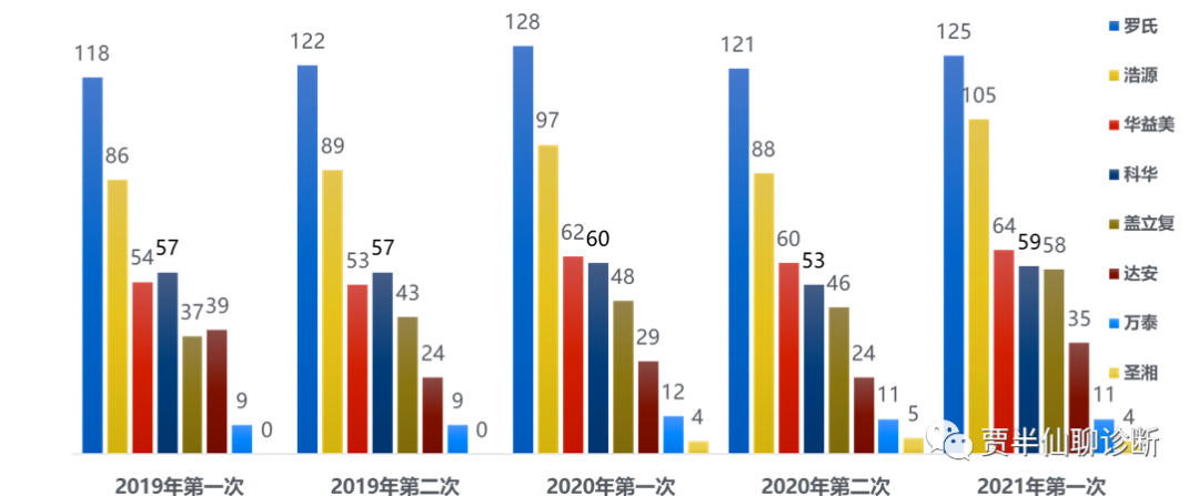 2019-2021年血站中各核酸检测厂家终端客户数量的变化