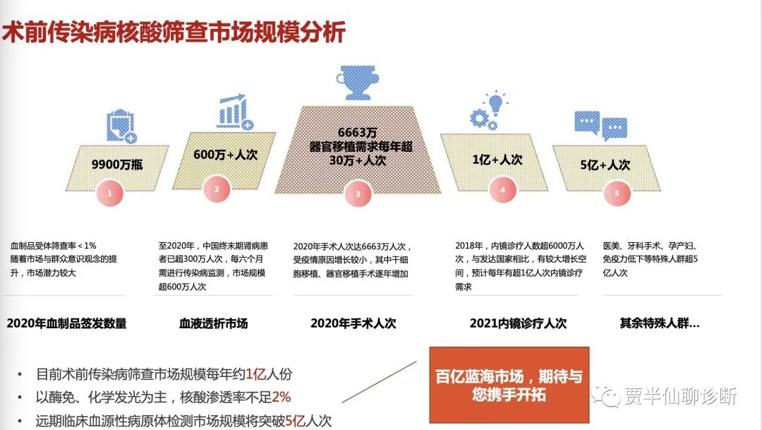 目前临床上怎么开展EQA尚没有引起重视,也没有官方的声音出现。血站每年组织2次血液筛查核酸检测EQA活动,未来不外乎有三种思路: ① 临床医院的血源性筛查纳入血站EQA,但涉及到国家临检中心不同科室监管职责的问题 ② 在血站EQA的基础上予以简化调整 ③ 按照临床筛查阳性后需要诊断、治疗的需求,在现有的HBV/HCV/HIV单项的基础上开发出一套符合临床特征的EQA计划 四、临床术前核酸筛查的市场分析与产品分析前面做了3期的临床术前核酸筛查分享,今天最后收个尾,作为产品经理对这个产品的市场分析和产品定位,3-5年后再回看今天的分析,希望不被打脸。 01 市场分析