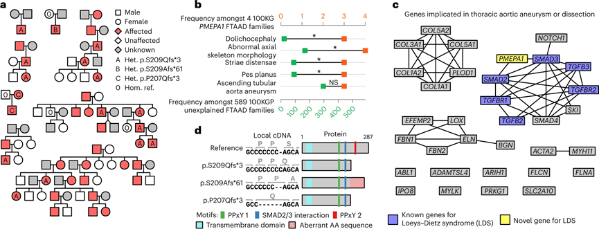 Loeys-Dietz综合征是一种罕见的遗传性疾病,其特征包括动脉瘤、动脉破裂、软骨发育异常等,这些症状可能会对患者的生命造成威胁。PMEPA1的高致病性突变与Familial thoracic aortic aneurysm disease(FTAAD)有关。在正常转录本ENST00000341744.8的最后一个外显子中,七个胞嘧啶的连续区间内有一个胞嘧啶插入的变异。该变异会引起一个p.S209Qfs3的移码,产生致病性最高的变异。在100KGP队列中,在三个欧洲祖先的FTAAD谱系中观察到这个变异。这个关联在三个额外的病例集中得到了复制。首先,在日本患者群体中,有三个谱系的八名患者独立发现了相同的变异;其次,在100KGP Pilot Programme的另一个病例集中,发现了同一段多胞嘧啶区间内的单个胞嘧啶缺失变异,编码为p.S209Afs61。;最后,在比利时的一个家族中,受影响的成员携带了同一段多胞嘧啶区间的5个碱基缺失,引起了另外两个变异上游两个氨基酸的移码 (p.P207Qfs*3)。这些结果表明,PMEPA1基因最后一个外显子的截短突变会导至Loeys-Dietz综合征。 图2 PMEPA1中的截短变异导至Loeys-Dietz综合征(图源:[1])