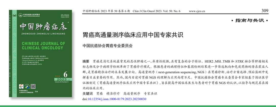 | 胃癌是消化系统最常见的恶性肿瘤之一,异质性较强,具有复杂的分子特征。HER2、MSI、TMB和NTRK融合等肿瘤相关标志物及分子病理学检测革新了胃癌诊疗模式。根据患者的病理特征和基因检测结果来进一步筛选靶向和免疫药物的潜在获益人群,是胃癌精准治疗的未来发展方向。高通量测序(NGS)在胃癌诊断、治疗方案选择、预后监测中发挥着日益重要的作用。然而,国内目前对胃癌高通量测序的应用尚无标准规范。2023年3月,由中国抗癌协会胃癌专业委员会牵头,行业内资深专家共同商讨并撰写的胃癌领域全国首个NGS专家共识——《胃癌高通量测序临床应用中国专家共识》(下文简称本共识)正式发表于核心期刊《中国肿瘤临床》(Vol.50, No.6),为胃癌的临床诊疗再添利器。本共识基于循证医学证据,汇集并分享了行业内资深专家的诊疗智慧与临床经验,期望提高中国临床医生与患者对于胃癌高通量测序的认识,以指导与规范胃癌高通量测序在国内的临床应用。作为中国领先的精准医疗解决方案提供商,先声诊断作为唯一一家医学检验服务机构全程参与了本共识的编撰工作。此前,先声诊断已参与了《骨与软组织肿瘤二代测序中国专家共识(2021年版)》《ctDNA高通量测序临床实践专家共识(2022年版)》等多个领域国内首个专家共识的编写,凭借自身在精准医疗领域的长期学术积累与科研创新,助力中国临床精准诊疗的快速发展。共识原文发表于《中国癌症防治杂志》(Vol.50, No.6),点击文末“阅读原文”可跳转在国内,先声诊断较早开展了肿瘤NGS大panel、MRD(minimal residual disease,微小残留病灶)及ctDNA领域的全面布局,具备完善的检测技术和产品。本次独家参与胃癌NGS共识的编写,标志着先声诊断在癌症NGS检测领域的专业实力跻身国内前列并备受专家认可。根据世界卫生组织国际癌症研究机构(IARC)近日发布的2020年全球最新癌症负担数据显示,2020年我国胃癌新发人数48万例,死亡人数37万例,占据全球胃癌发病人数的一半。本共识的发布,将指导临床实践在胃癌NGS检测的遗传性筛查、分子诊断、精准治疗、ctDNA液态活检等方面的应用,并对NGS的报告和实验规范等方面进行了推荐,有望进一步规范胃癌患者的个体化诊疗,造福更多中国患者。