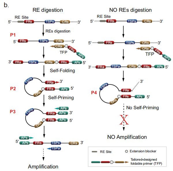 使用限制性酶(RE)消化作为原理证明。当酶识别的序列存在时,消化导至产生具有特定5′端的序列P1,而未消化的目标保持完整。在扩增步骤中,P1作为模板,通过定制设计的可折叠引物(TFP)启动线性链合成。对于消化的分子(P1),扩增在5′端停止,生成一个可以自我折叠的完整发夹结构(P3)的构建体,而对于未消化的分子,合成继续,不能进行后续的扩增(P4)。
