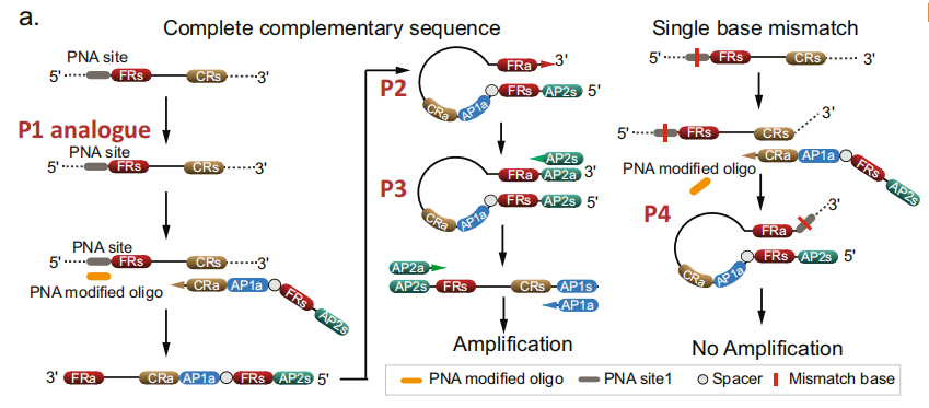 使用PNA修饰可以区分单碱基错配以及阻断聚合酶进展,PNA寡核苷酸的较高结合亲和力稳定了P1,同时也抑制了TFP在FR的5′端的延伸过程以生成P2。单碱基错配阻止了PNA寡核苷酸在靶序列上的杂交,这导至了P4的产生并阻止了扩增。