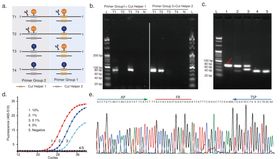 该方法的潜力在于,无需亚硫酸氢盐制备,使用限制性酶消化或是PNA寡核苷酸杂交来检测单个或多个甲基化位点。不仅如此,还适用于生成具有所需末端的任何策略,因此该技术可以很容易地扩展到使用基因编辑工具的其他方法,例如CRISPR。这种方法可使用PCR作为扩增步骤,也可以与其他扩增方法整合,或使用仪器简单的等温扩增方法。