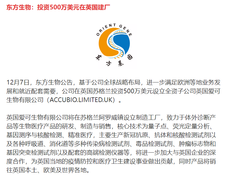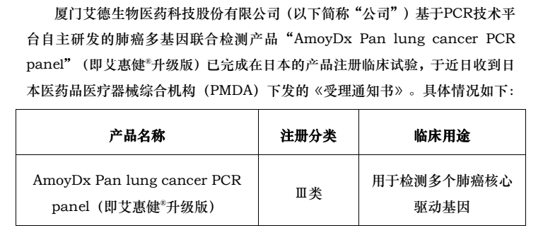 2023年3月27日,日本Riken Genesis与艾德诊断和PREMIA共同宣布,由艾德诊断开发的AmoyDx Pan Lung Cancer PCR panel(PCR-11, PLC)获得了日本厚生劳动省批准作为Retevmo(selpercatinib)伴随诊断产品。该款产品设计检测EGFR、ALK、ROS1、BRAF、RET、MET、HER2、KRAS、NTRK1、NTRK2、NTRK3 11个靶基因,包含融合与突变。根据艾德公告,公司2020年8月20日即已收到日本PMDA的受理,2021年6月29日公司官网发布信息,表示该该款产品获得PMDA批准用于9种靶向药物的伴随诊断。获得批准后,又成为包括默克(Merck KGa)Tepotinib MET抑制剂Tepotinib。2022年11月获准用于作为安进公司LUMAKRAS®(sotorasib)的伴随诊断,用于治疗KRAS G12C突变、不可切除、在接受系统性抗癌治疗后出现进展的晚期和/或复发性非小细胞肺癌(NSCLC)。如今,在日本的伴随诊断药物数量又获得扩展,正式成为Eli Lilly Selpercatinib(loxo-292)用于治疗RET融合阳性非小细胞肺癌(NSCLC)的伴随诊断。至此,艾德PCR-11 PCR多联检产品已经在日本成为12款靶向治疗的伴随诊断的一致选择。根据艾德生物2022年Q3财报,公司前三季度营收5.99亿元人民币,同比下滑7.2%。归母净利润1.21亿元人民币,同比下滑25.13%。根据公告,公司海外业务前三季度营收9016万元人民币,同比大增31%。海外收入占比约15%,而增长又是2位数的高增长,有点东西。当然,值得注意的是,根据新浪上市公司研究院的文章数据,无论是实控人的持股公司前瞻投资,还是管理层的持股平台厦门科英、厦门屹祥的持股比例均有下滑,尤其是公司的员工持股平台厦门润鼎盛,其持股比例由2017年的3.66%减少至目前的1.82%的水平。另外,需要特别指出的是,引用的这篇文章中有个观点实在不敢苟同。“核酸PCR试剂基材与肿瘤基因PCR试剂集采并无本质区别“,这个逻辑如果成立,台子的本质跟酒精洗手液理应同等价位。其实IVD企业出海并不鲜见,特别是这两年新冠疫情的加速下,更是出现了井喷的势头。老牌IVD企业科华生物,2020第一季度,其海外子公司TGS的销售收入就突破了6171万元,同比增长24.87%。复星医药医疗器械与诊断2020年上半年在海外实现营业收入13.11亿元,与中国销售收入13.27亿几乎持平。而新兴IVD企业更是生猛,圣湘生物2020年全年营收47.63亿元,海外营收占比高达53.49%,就问怕不怕。然而,一旦离开新冠检测这块肥肉,嘴里到底能留下多少油就成了至关重要的一个必答题。艾德生物选择继续加大在肿瘤检测在海外的布局,而东方生物则有着更为深入的思考和布局,直接选择在海外建厂。华大基因也在埃塞俄比亚建立了IVD生产工厂,前期主要是生产核酸检测相关产品,后续估计会根据全球布局需要进行调整。很多人觉得,走出海外就一定要掌握定价权,攫取高额的利润。想想把内卷的能力带到海外,让国外人民群众用上平价产品,也算是实现人类命运共同体了吧。话说回来,不管是出去卷还是不卷,能把触角伸出去,不再盯着国内一亩三分地,吸收全球的营养,中国的IVD企业才能真正的硬核起来。注1:https://www.rikengenesis.jp/dcms_media/other/JointRelease_RET_Approval_Mar27.2023.pdf注2:https://www.globenewswire.com/news-release/2021/06/30/2255272/0/en/AmoyDx-Pan-Lung-Cancer-PCR-Panel-Receives-MHLW-Approval-as-Companion-Diagnostic-for-9-Targeted-Therapies-for-Use-in-Patients-with-Advanced-Non-Small-Cell-Lung-Cancer.html注3:https://pdf.dfcfw.com/pdf/H2_AN202210241579405488_1.pdf?1666644741000.pdf注4:https://finance.sina.com.cn/stock/observe/2022-09-21/doc-imqmmtha8211303.shtml