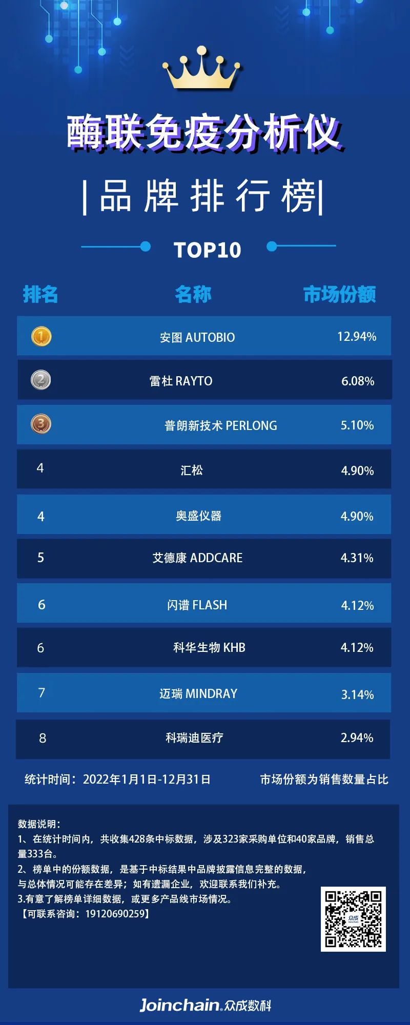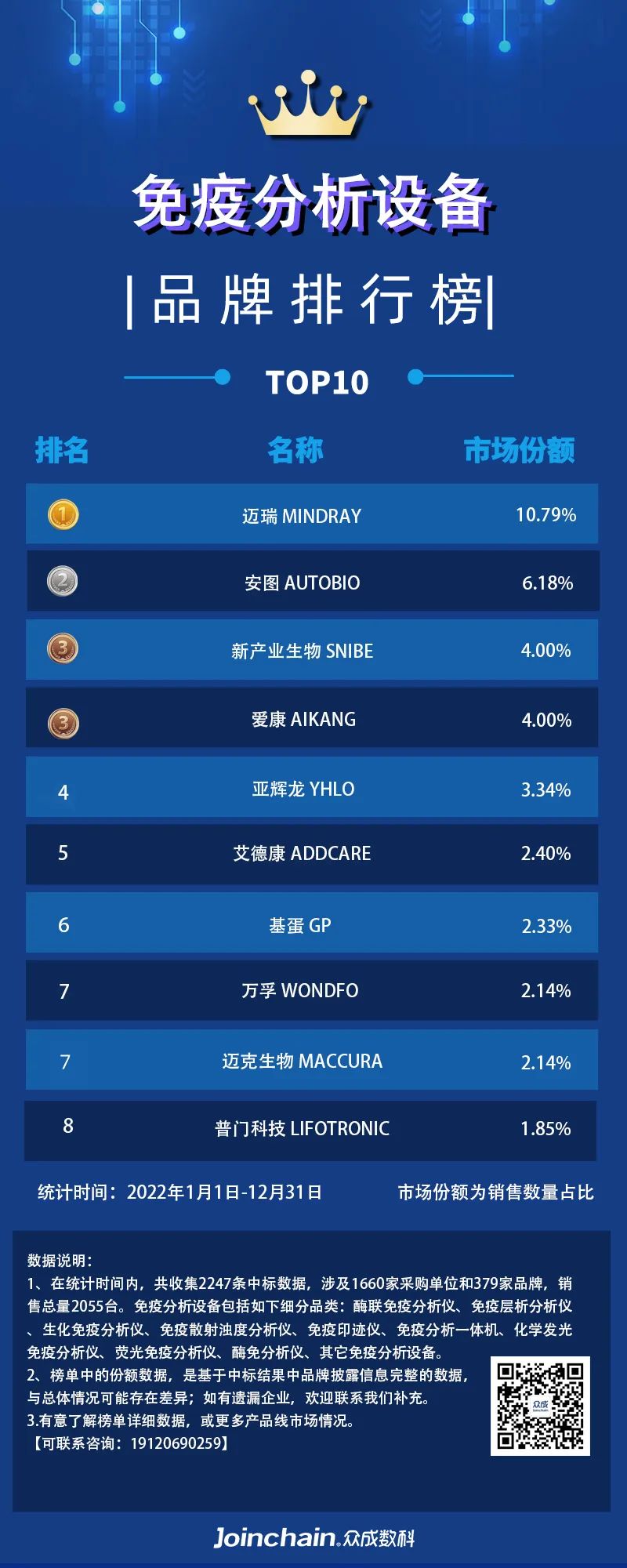本文统计产品为免疫分析设备,包含细分品种:酶联免疫分析仪、免疫层析分析仪、生化免疫分析仪、免疫散射浊度分析仪、免疫印迹仪、免疫分析一体机、化学发光免疫分析仪、荧光免疫分析仪、酶免分析仪、其它免疫分析设备。