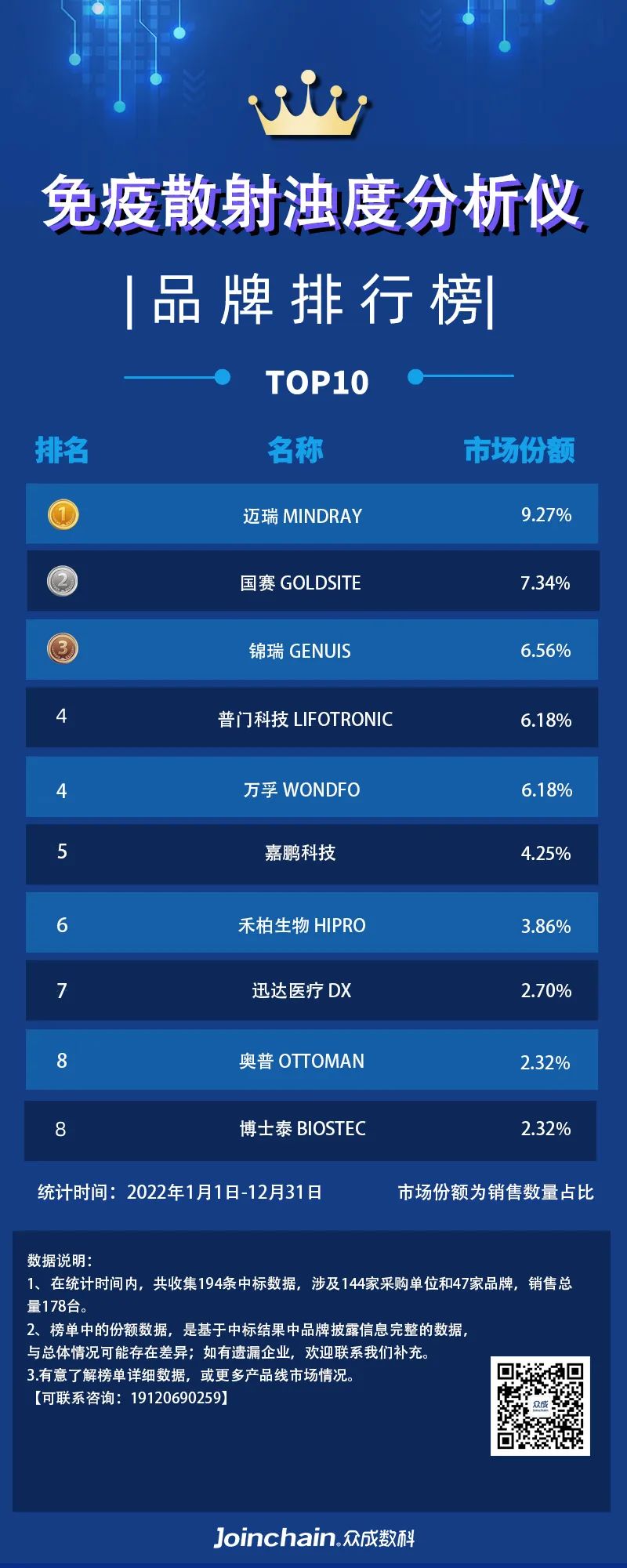 01 免疫分析设备 图1:2023年2月免疫分析设备品牌排行榜 数据来源:MDCLOUD(医械数据云) 02 细分品种 图2:2023年2月化学发光免疫分析仪品牌排行榜 数据来源:MDCLOUD(医械数据云) 图3:2023年2月酶联免疫分析仪品牌排行榜 数据来源:MDCLOUD(医械数据云) 图4:2023年2月其他免疫分析仪品牌排行榜 数据来源:MDCLOUD(医械数据云) 图5:2023年2月荧光免疫分析仪品牌排行榜 数据来源:MDCLOUD(医械数据云) 图6:2023年2月免疫散射浊度分析仪品牌排行榜 数据来源:MDCLOUD(医械数据云) |