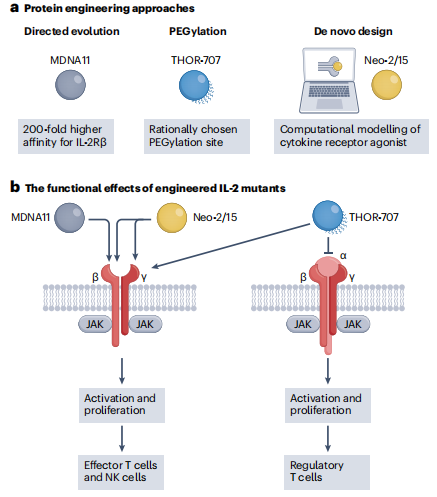 免疫细胞是细胞因子的主要来源,在感染、炎症或内源性刺激下分泌。细胞因子与靶细胞上的受体结合后诱导细胞内信号,促进特定的生物学过程,具体取决于细胞因子和细胞类型,包括激活调节表观遗传修饰、细胞因子合成和增强代谢的酶,以及触发细胞增殖或凋亡。细胞因子的一个决定性特征是它们诱导不同表型特征的能力,导至各种生物学后果。由于细胞因子在许多免疫介导的疾病中起着关键作用,因此已将其作为治疗靶点进行了研究,如自身免疫和炎症性疾病。然而,开发基于细胞因子的疗法仍然具有挑战性。细胞因子的半衰期短、多效性和不利的组织分布都导至其治疗范围狭窄。 近日,一组来自世界各地的研究团队在杂志Nature reviews bioengineering上发表了一篇题为“Engineering cytokine therapeutics”的综述文章。研究团队首先讨论如何利用生物分析技术的进步来加深对细胞因子生物学的理解。然后描述了与细胞因子治疗相关的蛋白质工程、纳米医学、RNA技术和细胞工程方面的创新。研究团队表明,生物工程人员可以利用相关知识,为各种免疫介导疾病开发安全、有效的基于细胞因子的疗法。 图片来源:Nature reviews bioengineering 一 使用蛋白质工程工具设计重组细胞因子疗法 1. 定向进化 可以采用两种策略来开发蛋白质突变体;定向进化和蛋白质理性设计。在定向进化中,随机突变被引入感兴趣的基因中,随后使用多种选择方法,例如酵母和噬菌体展示,以获得具有所需功能的蛋白质。与理性设计相反,定向进化不依赖详细的结构知识和蛋白质3D结构预测,因为它基于突变体的功能选择。因此,定向进化是工程蛋白的一种流行且成功的策略。 2. 理性设计 已开发出合理重新设计细胞因子的方法,而不是使用定向进化。这些技术在很大程度上依赖于细胞因子结构的详细知识和先进的蛋白质模型。例如,IL-22的晶体结构与其受体复合物IL-22Rα/IL-10Rβ结合,使得通过突变四个关键氨基酸残基降低对IL-10Rβ的亲和力成为可能。这种IL-22突变体具有更高的受体和细胞特异性,从而减少了不良的促炎症反应,并保持了其体内再生功能。为了减少多效性,类似的方法设计了治疗有效的细胞因子变体,如IL-10、IFNγ、IL-12和IL-4。 3. 聚乙二醇化 细胞因子的循环半衰期决定了细胞因子疗法的体内效应。用聚乙二醇(PEG)使蛋白质功能化是延长其在循环中持久性的一种有效方法。聚乙二醇化增加了蛋白质的分子量,扩大了流体动力学直径,从而减少了肾脏清除率,并减少了与血浆成分的相互作用,从而降低了免疫原性。聚乙二醇化已成功应用于集落刺激因子和干扰素。 Synthorx设计了一种新的PEG-IL-2变体(THOR-707),THOR-707的PEG部分特异性阻断与IL-2Rα亚基的结合位点,但保持与其他受体亚基的相互作用(图b),改善了效应T细胞和NK细胞的扩增和激活,并在癌症模型中显示出更好的药代动力学和安全性特征。聚乙二醇化细胞因子的一个可能的限制是患者可能产生抗PEG抗体,该抗体可使细胞因子失活或引发炎性免疫反应。 4. 计算方法 借助于计算和数据驱动方法以及硬件和算法能力的最新进展,蛋白质可以从头设计。计算工具有望帮助克服细胞因子药物的关键限制,包括多效性、冗余性、不良药代动力学和毒性。可以采用从头蛋白质设计来创建合成细胞因子(合成蛋白),例如IL-2Rβ/IL-10Rβ、IL-2Rβ/IL-4Rα或IL-4Rβ/IFNαR2,从而激活不同的信号通路。从头设计方法还提供了一种有效分离细胞因子多效性和靶向特异性途径的策略。从头设计的蛋白质本质上是外来的,因此可能存在免疫原性问题,这是新细胞因子临床转化的重要考虑因素。 重组细胞因子。 图片来源:Nature reviews bioengineering 二 靶向和递送 1. 融合蛋白修饰细胞因子 在基因层面上融合一种细胞因子与其他蛋白质可以帮助重塑细胞因子的生物分布特征。该方法可用于将细胞因子靶向特定位点或细胞类型。细胞因子融合物有助于促进肿瘤定位,克服细胞因子药物不良的药代动力学财产和不利的生物分布特征。 免疫细胞因子:过去15年 多年来,已设计出具有IL-2的多抗体-细胞因子融合构建物,称为免疫细胞因子,并正在进行治疗各种类型癌症的临床试验。将IL-12基因融合到肿瘤靶向抗体可以增加这种细胞因子的治疗窗口并限制毒性,如将IL-12融合到L19抗体(抗Fibronectin,在许多癌症中过量表达在血管上)。大多数免疫细胞因子的目的是向肿瘤输送促炎细胞因子,但也可以将抗炎细胞因子导向炎症组织。IL-22免疫细胞因子靶向肠道黏膜以治疗溃疡性结肠炎。 免疫细胞因子与非靶细胞的相互作用会引起副作用。为了提高受体和细胞特异性,新的工程疗法将免疫细胞因子方法与重组细胞因子突变体相结合。比如Orionis Biosciences正在开发一种AcTakines,它结合了靶向抗体和受体亲和力降低的细胞因子突变体。AcTakines的亲和力降低会阻碍细胞因子活性,直到融合蛋白在靶细胞上的细胞因子受体附近聚集,从而降低脱靶效应。 肿瘤定位:胶原蛋白是TME(肿瘤微环境)的主要成分,因此是细胞因子肿瘤定位的有趣靶点。有研究团队将胶原结合蛋白与IL-2或IL-12融合,在肿瘤内给药时将这些细胞因子锚定在TME中的胶原上(下图a)。 前药策略:克服脱靶效应的一种方法是设计前药结构,通过与细胞因子连接的肽或蛋白质使其失去活性。例如,失活单元可以被疾病部位过表达的蛋白酶