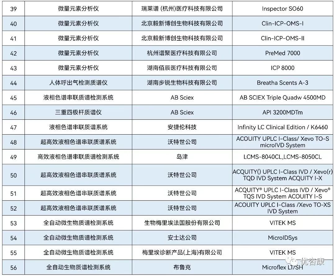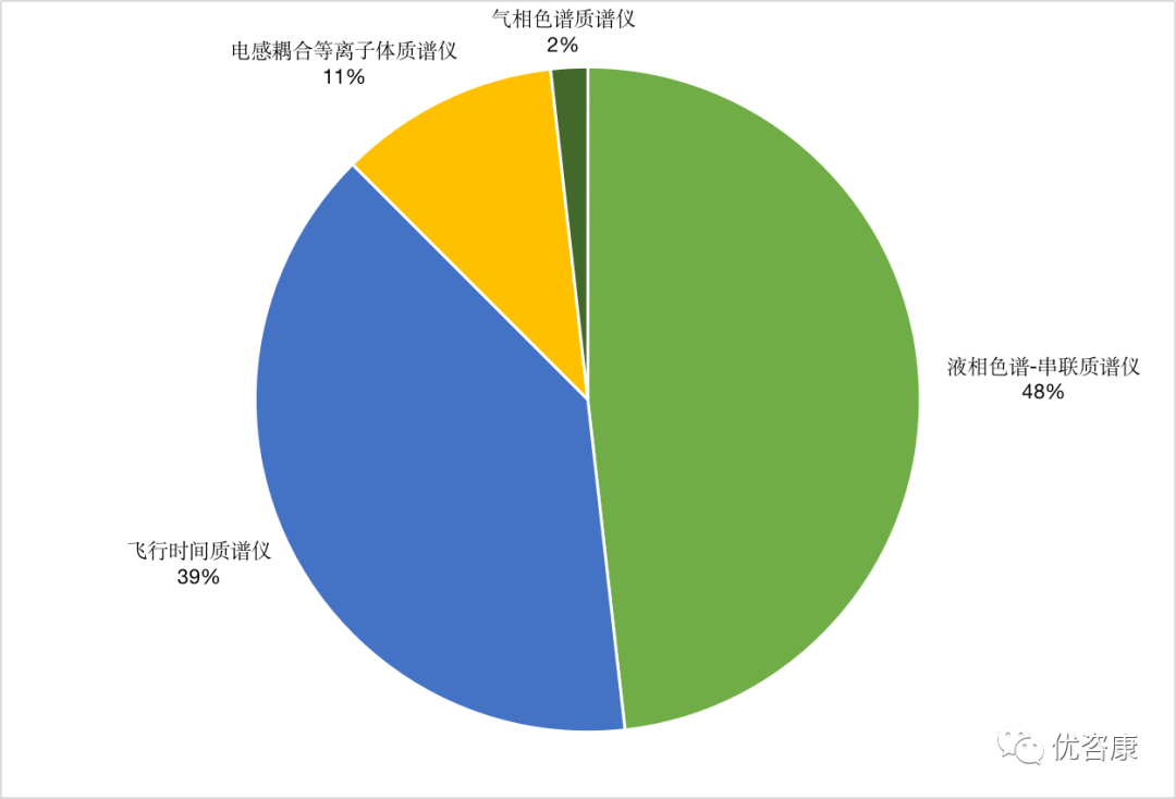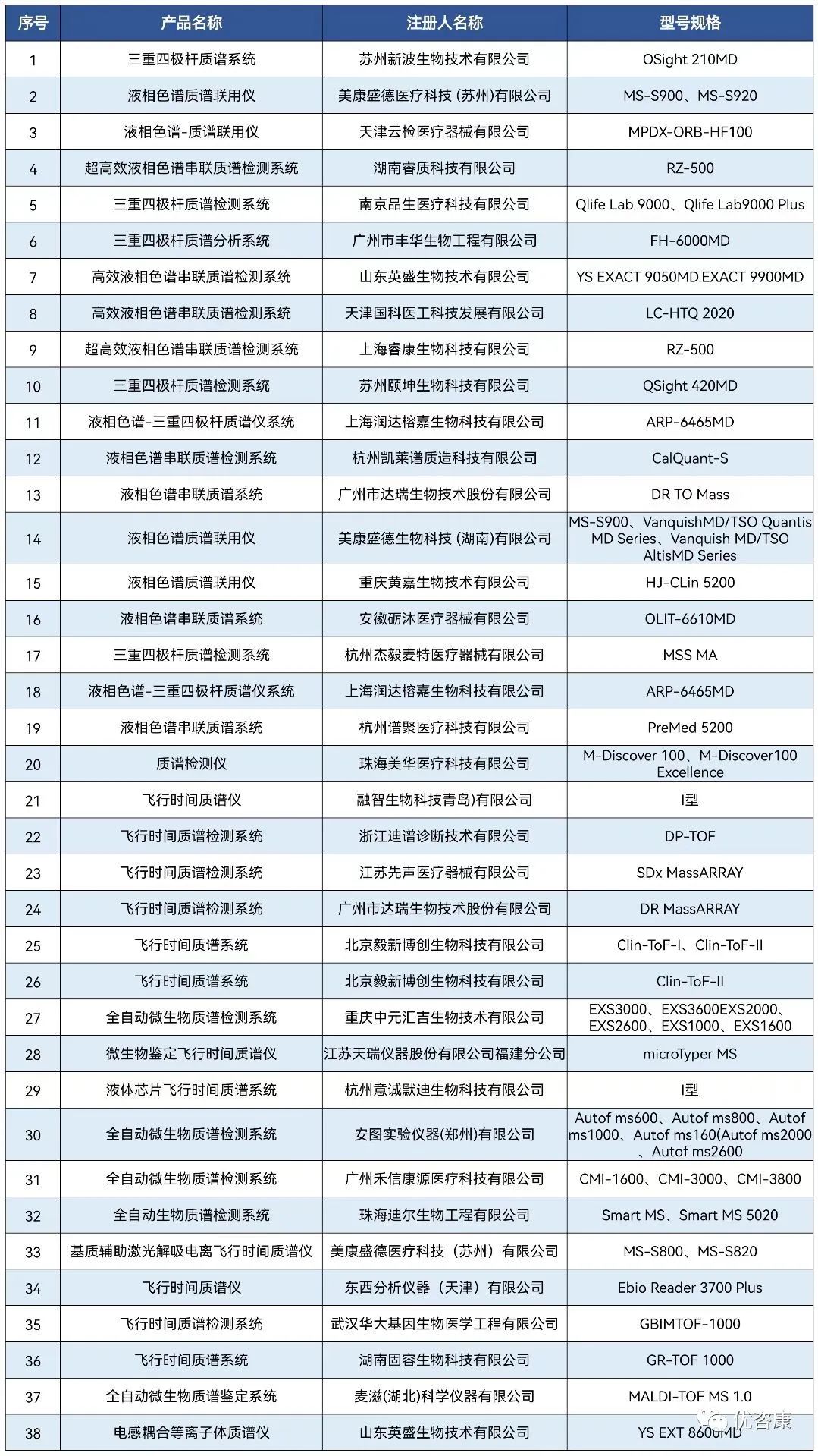 | 临床质谱,是指针对临床上特定分子的检测需求,结合了质谱仪器、试剂、耗材及样本前处理的一整套解决方案的统称。作为新兴的临床检验技术代表之一,质谱技术因其快速、准确、特异性高等优点,逐渐由科研走向临床诊断。质谱作为高精尖技术,在临床检验中的应用也越来越广泛和深入,如维生素检测、新生儿遗传代谢病筛查、TDM血药监测、固醇类激素检测以及代谢组学和蛋白组学研究等,主要技术平台包括液相色谱串联质谱(LC-MS/MS)、基质辅助激光解吸飞行时间质谱(MALDI-TOF MS)、电感耦合等离子体质谱(ICP-MS)等。而在2023年1月5日和3月8日,接连获证两款核酸质谱试剂盒,核酸与质谱的结合也逐渐步入大家的视野。下面小编将对已上市质谱仪器设备、核酸质谱试剂以及2022年进入临床试验的质谱项目进行详细分析。 截至目前,国内获得NMPA注册证的质谱设备共56个,涉及45家公司, 8家国外企业,37家国内企业。其中液相色谱-串联质谱仪27个,飞行时间质谱仪22个,电感耦合等离子体质谱仪6个和气相色谱质谱仪1个,见图1。 质谱仪器设备具体信息如下: