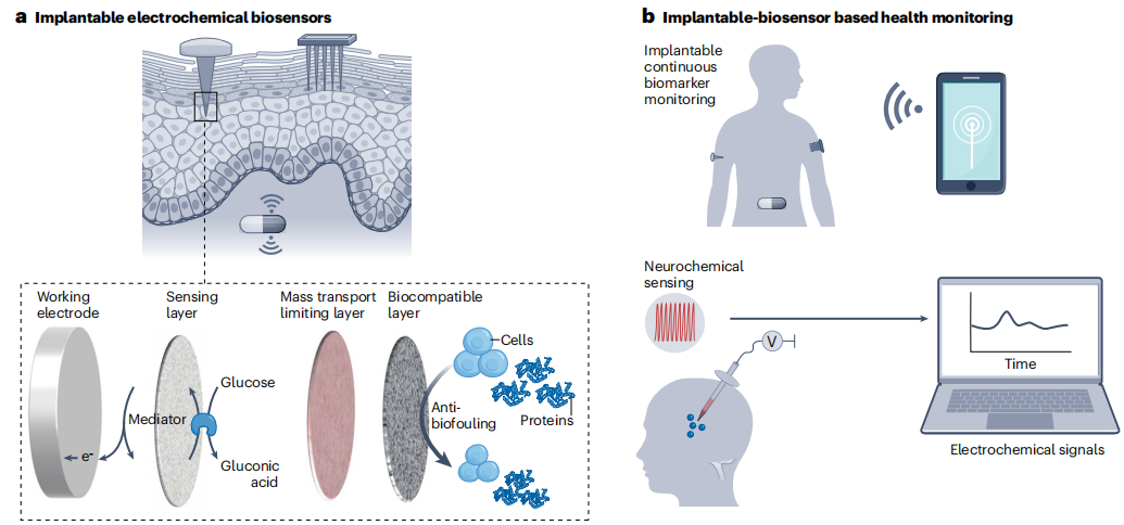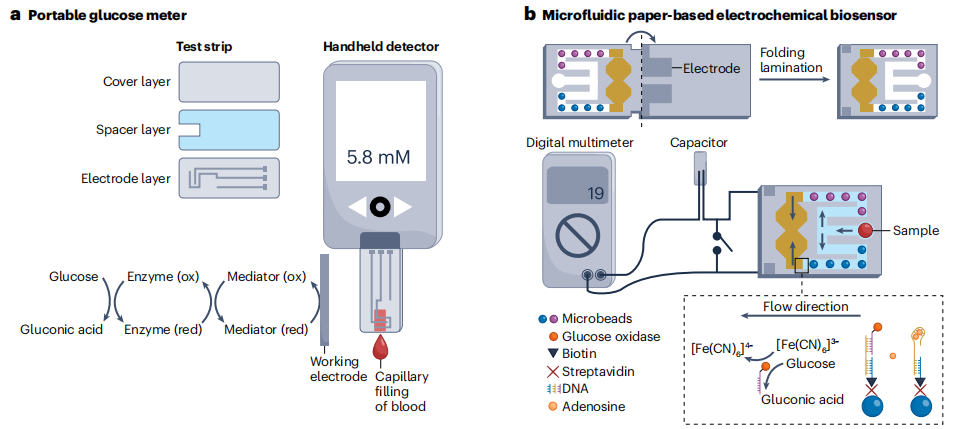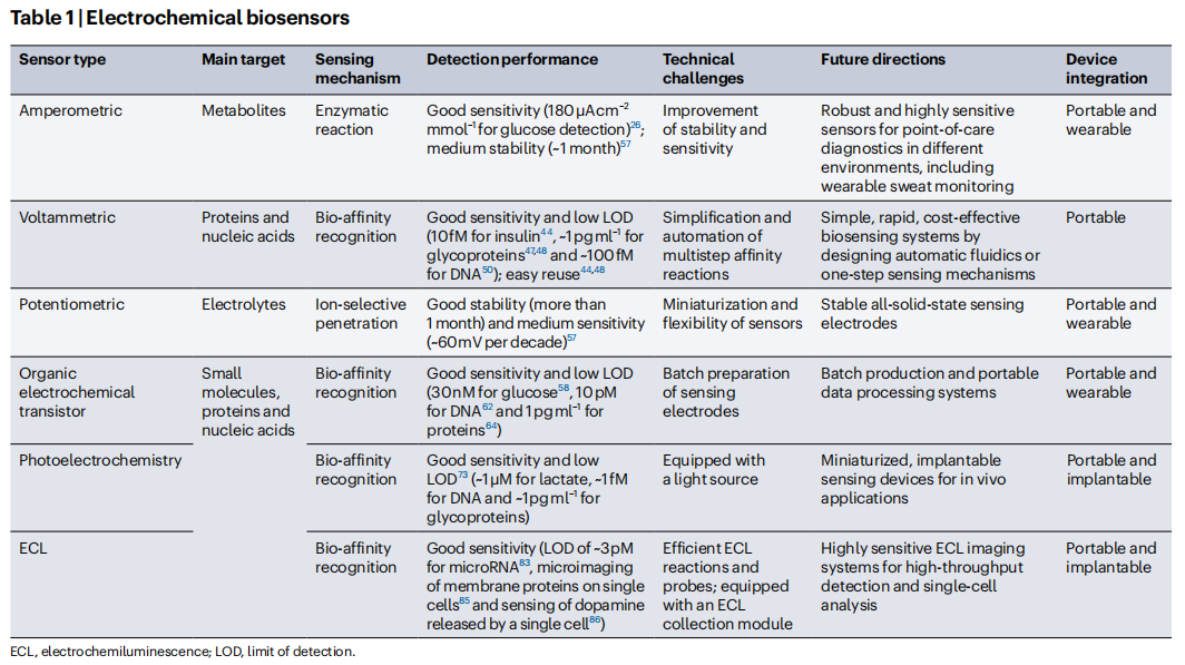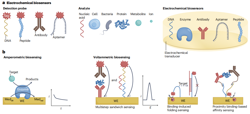 自1962年Leland-Clark Jr引入用于葡萄糖电流型传感器以来,生物传感器已被广泛应用于临床、工业、环境和农业分析。尽管已经开发了各种生物传感器来灵敏和选择性地检测一系列与疾病相关的分子,但由于难以将生物传感器集成到便携式设备中并使其小型化,生物传感器的临床转化仍然有限。 在不同的生物传感平台中,电化学生物传感器特别适合于设备集成,因为易小型化、批量制造,电流和电势等电化学信号可以通过简单、便携、低成本的低功耗外围仪器进行采集。科学技术的进步引领了电化学生物传感器在可穿戴和植入式设备中的集成,来实现对生理分子的微创或无创连续测量。电化学生物传感器可以集成到柔性薄膜、纺织品、眼镜、牙齿和尿布中,来实现对不同生物流体(例如脑脊液、间质液、汗液、唾液、眼泪和尿液)中分子的长期检测。 近日,来自南京大学、东南大学、南京邮电大学的研究团队在杂志Nature reviews bioengineering上发表了一篇题为“Device integration of electrochemical biosensors”的综述。在这篇综述中,研究团队讨论了用于个性化POC诊断设备的电化学生物传感的关键创新。讨论了用于疾病诊断、健康管理、细胞监测和神经科学的电流型、电位型、有机电化学晶体管(OECT)、光电化学和电化学发光生物传感器的设计和集成,以及未来需要努力的方向。 图片来源:Nature reviews bioengineering 一、电化学传感概述 电化学生物传感器是独立的分析设备,其中生物识别元件与电化学转导元件直接接触,以允许对分析物进行灵敏和特异的检测。根据设计和传感器类型,可以在不同体液(包括血液、唾液和眼泪)中快速分析与健康相关和疾病相关的生物标志物(如下图a),如碳水化合物、蛋白质、核酸和细胞。电化学生物传感器,包括电流法、伏安法、电位法、有机电化学晶体管、光电化学和电化学发光传感器,可以集成到可穿戴、便携式和植入式设备中,以实现护理点诊断和健康监测。 电流型生物传感器:电流型生物传感器是检测代谢物(例如葡萄糖、乳酸和尿酸)最常用的传感器。靶特异性酶(例如,葡萄糖氧化酶(GOx)、或乳酸氧化酶)固定在工作电极上,以恒定电位催化靶的氧化(如下图b)。电流型生物传感器制造简单,在目标检测中具有高灵敏度和高选择性,适用于可穿戴应用。纳米材料也可以添加到生物传感界面促进电子转移,从而提高灵敏度并降低检测极限。例如,Au-Pt双金属纳米催化剂与纳米多孔水凝胶相结合,能够以180 μA cm–2 mmol–1的灵敏度,0.01 mg dl−1(0.56 μM)的检测限,使生物传感器与用于泪液葡萄糖测量的智能隐形眼镜集成。 伏安法生物传感器:疾病生物标志物,如蛋白质和核酸,是通过亲和识别来检测的,不能在生物传感表面直接产生电子转移。大多数亲和传感器都是伏安生物传感器,操作繁琐(下图b)。一步亲和传感器提供了一种更简单的方案,靶标的检测依赖于结合诱导的探针DNA刚性的变化,导至氧化还原标签靠近或远离电极表面,导至靶标生物传感的电流信号相应增加或减少。该信号可以使用DNA杂交策略进行扩增以提高敏感性;发夹DNA探针可以进一步提高这种DNA传感器的灵敏度。 基于邻近结合的亲和电化学生物传感器适用于蛋白质生物标志物检测。在这种生物传感器中,一对抗体-DNA亲和探针双重识别靶蛋白,启动DNA组装,导至电极表面上的电活性分子标记的探针DNA处于“开”或“关”状态。此类传感器的灵敏度可以通过DNA扩增策略进一步提高降至皮克每毫升或亚皮摩尔水平。 电化学生物传感器。 图片来源:Nature reviews bioengineering 电位生物传感器:电位生物传感器通过测量与传感电极上的目标识别时表面电荷变化相关的电位信号,可以直接检测目标(下图c)。固体和液体膜电极可以集成到临床分析仪中,用于检测血液电解质(例如,Na+、K+、Ca2+、H+和Cl-)。酶、核酸和蛋白质可以通过将目标生物识别事件与离子反应相结合来检测。固体接触离子选择电极受益于坚固性和易于制造、修饰和小型化,允许通过检测从纳米粒子标记的探针释放的离子来进行蛋白质和核酸分析。所有固态离子选择电极也可以集成到可穿戴设备中,用于生物流体中的离子检测;例如,在柔性传感阵列上具有Na+和K+离子选择电极的可穿戴“智能腕带”能够对汗液中的Na+和K+进行原位分析。 有机电化学晶体管生物传感器:OECT生物传感器(下图d)与靶标的特定反应影响界面电位,从而产生用于靶标定量的通道电流响应。OECT生物传感器具有高灵敏度、低成本、灵活性、易于制造和低工作电压 ,允许通过静电相互作用或亲和力结合来检测电活性(例如多巴胺、葡萄糖和肾上腺素)和无电活性(例如皮质醇、DNA、蛋白质、细菌、细胞和聚糖)分子或生物大分子。 OECT生物传感器可以很容易地小型化、集成到设备中并设计成阵列。OECT生物传感器的灵活性和稳健性使其适用于可穿戴设备中生物分子的非侵入性检测。例如,织物OECT生物传感器可以嵌入尿布中,以监测人工尿液中的葡萄糖,通过蓝牙在手机上收集传感信号。 光电化学生物传感器:光电化学生物传感系统基于在生物传感器表面识别目标时光电流的变化,这由于电子供体和受体之间的光电化学反应而引起电荷或能量转移。光电化学生物传感器结合了光学和电化学分析的优势,特别是用于检测疾病相关分子,如谷胱甘肽、乳酸、DNA、miR