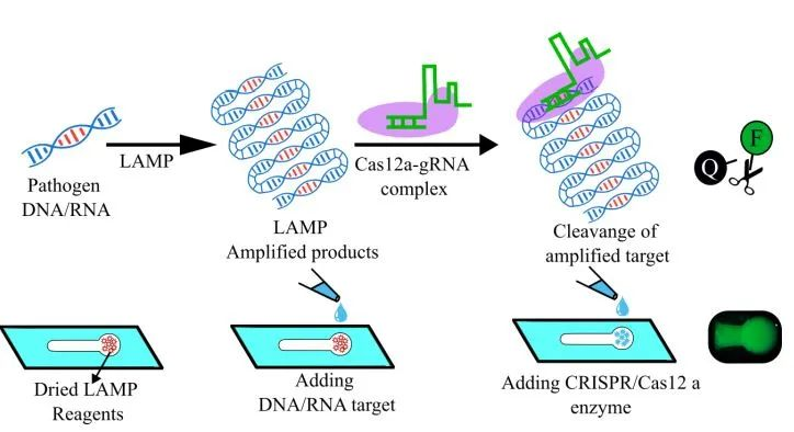 成功管理传染病和流行病的首要任务是快速准确地检测病原体,新冠就是一个最好的例子,并且POC检测的重要作用和需求也在疫情中凸显出来。 根据世卫组织给出了关于POC检测的ASSURED标准:价格合理(Affordability)、灵敏度(Sensitivity)、特异性(Specificity)、易操作(User-friendly)、快速可靠(Robust)、便携性(Equipment-free)及即时性(Deliverable)。 但是其实,要开发出符合所有这些标准的病原体特异性POC检测还是有难度的。因此,利用现有技术的结合一直是近些年体外诊断企业的重点努力方向。 其中最具有突破性并已有结果的一个技术就是结合了等温扩增的CRISPR技术,满足了ASSURED标准,是开发新一代POC诊断的理想方法。 本文将重点总结基于LAMP的CRISPR技术,围绕以下几个方面分享: 1)LAMP和CRISPR技术 2)为什么选择LAMP与CRISPR技术结合 3)LAMP-CRISPR技术在POC平台上应用 01 LAMP LAMP环介导等温扩增是在2000年由日本荣研化学株式会社纳富继宣博士发明的一种简单、快速、准确、便宜的新型基因扩增方法,随后被用于各种人体、动物和农业的病原体检测。尤其是在新冠疫情期间,随着许多改良的LAMP方法应用于检测SARS-CoV-2病毒,LAMP技术已进入了黄金时期。 该技术主要特点是用到4-6个识别目标DNA 特定区域的引物。扩增反应首先由具有链置换活性的Bst酶和两个特别设计的引物引发形成环状结构,引起随后几轮扩增后产生大量的DNA。通常来说,1 - 10个DNA拷贝可在15-60分钟内扩增获得 10^9 – 10^10 拷贝的DNA产物,是灵敏度和特异性都很高的扩增方法。 LAMP反应操作简便,不需要像qPCR一样经过不同温度循环,可以在60-65°C恒温下扩增,其反应结果可以通过浊度法、荧光法和探针法进行观察。 02 CRISPR CRISPR (Clustered Regularly Interspaced Short Palindromic Repeats,基于成簇间隔短回文重复序列 )作为一种基于RNA的后天免疫防御系统,其间隔序列与噬菌体或质粒序列存在同源性,能利用靶位点特异性的RNA指导Cas蛋白靶向几乎所有生物和细胞中遗传错误的基因。 CRISPR/Cas系统由靶向外源基因组材料特定区域的引导RNA序列(gRNA)和效应Cas(CRISPR相关核酸酶)蛋白组成。 CRISPR/Cas系统是一种非常独特且极具前景的技术,可用于基因编辑和分子诊断,能够通过编程gRNA序列靶向任何基因区域,其在传染病检测中最重要的作用是通过使用Cas蛋白识别病原体和基于核酸的诊断。 CRISPR/Cas技术在核酸检测中的使用需要前置扩增或后置扩增。通过将CRISPR/Cas技术与PCR或等温扩增,如LAMP、RPA、NASBA和RCA等方法相结合,开发了新一代的分子诊断方法,可以高灵敏度和特异性检测DNA和RNA。 03 LAMP-CRISPR 基于LAMP的CRISPR技术是近年来研发出用于病原体检测的新一代分子诊断技术,这种技术的结合应用消除它们单独使用时存在的限制。 比如说,LAMP虽然有快速扩增的优势,但是很容易出现假阳性的问题。不正确的引物设计、受污染的DNA和未优化的反应体系(如缓冲液pH值、Mg浓度、具有干扰作用的染料)可能导至检测的特异性和灵敏度降低。 而CRISPR/Cas技术使用reporter来检测特异性靶标,可以消除LAMP的局限性,降低假阳性结果的可能,实现高灵敏度和高特异的检测。 结合LAMP的CRISPR/Cas技术可以通过荧光层析纸条或直接肉眼判断检测结果,不需要像其他核酸检测一样进行定量测量,实现高效、灵敏、特异且不需要复杂设备的POC检测。 LAMP-CRISPR/Cas技术已被用于检测各种传染性病毒和细菌(表1)。在许多检测中,这种技术对病原体检测中显示出高达100%的特异性和灵敏度。与金标准qPCR相比,LAMP-CRISPR检测周转时间更短,非常适合用于快速检测。 表1 各种LAMP-CRISPR/Cas应用平台比较 尽管如此,LAMP-CRISPR/Cas也是具有一些局限性的,主要源于这项技术需要两个步骤,即扩增过程和CRISPR/Cas过程。这两个过程具有不同的化学成分和反应条件。LAMP扩增中使用的Bst酶反应温度在60-65度,而CRISPR反应的Cas酶在37度左右,整个反应需要两个不同的温度。使用两种不同的反应过程和反应体系可能会增加污染风险。 目前,也有解决办法可以克服这个局限性,比如说,在HOLMESv2检测中,通过使用嗜热Cas12b(从嗜酸芽孢杆菌中分离)实现单管反应,解决不同反应温度的问题。 也有的为了最大限度地降低对操作人员的技术需求和污染风险,通过在反应试管底部用油密封LAMP试剂,把CRISPR试剂反应管盖上来实现单管反应。LAMP扩增后,将试管倒置混合启动CRISPR/Cas12a过程。 CRISPR/Cas技术也可以与PCR和其他等温方法相结合,如NASBA、RCA和RPA,但是都具有一定局限性。 比如说由于需要用于热循环的复杂设备,PCR在POC诊断平台中不是优选的。 与LAMP类似,其他等温扩增方法也不需要复杂的设备,不过它们通常需要两个引物、两种或多种酶。例如,NASBA需要使用三种酶来扩增RNA或单链DNA,此外与其他方法相比,CRISPR和NASBA组合的灵敏度较低。相比之下,LAMP技术通过使用单一的Bst酶成本和操作复杂性更低。并且LAMP通过使用多个引物提供了更高的特异性和更高的效率。 RPA虽然用的也较多,不过RPA需要最后一步将扩增产物转化为RNA分子,因此,它经常与Cas13酶结合使用,它最主要的优势是RPA反应的温度跟CRISPR反应温度接近,但是最大局限性是和CRISPR扩增的产物浓度较低。它在靶标浓度低的时候灵敏度不如LAMP好。当使用CRISPR组合LAMP时,可以获得高浓度的扩增产物。因此,LAMP优于其他等温方法更被优于选择与CRISPR技术结合使用在POC诊