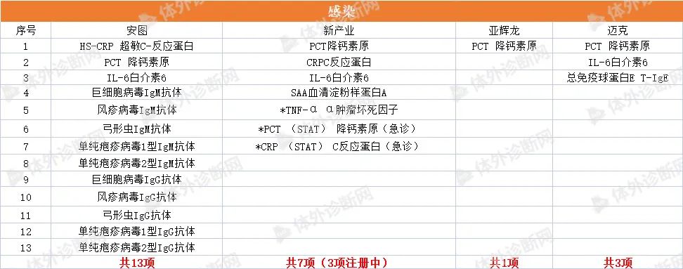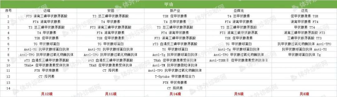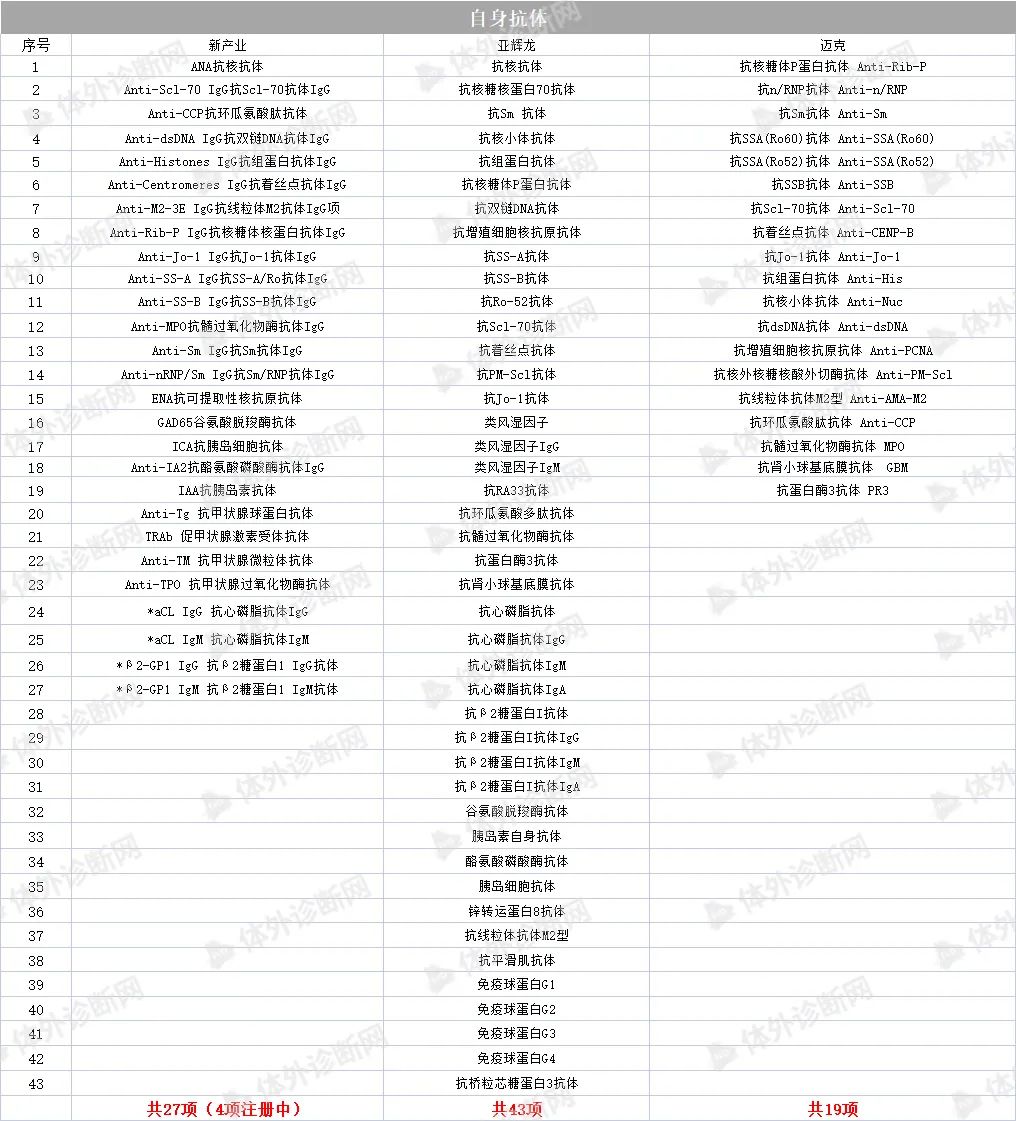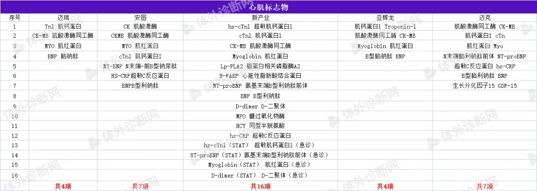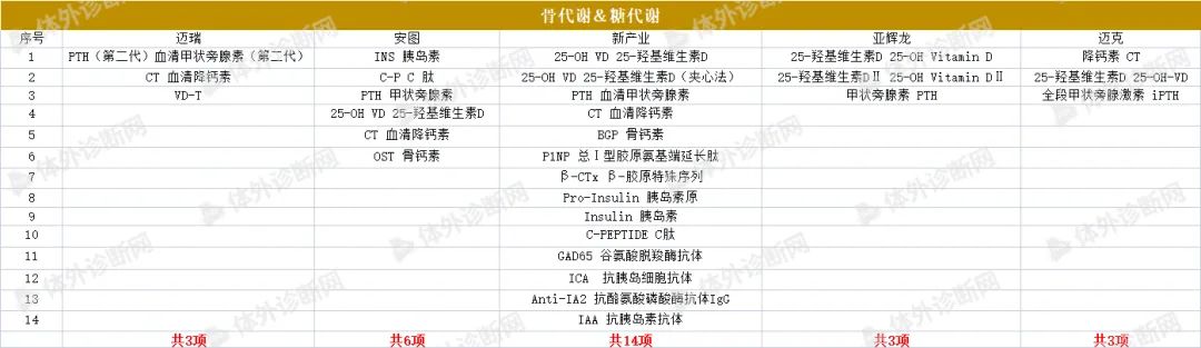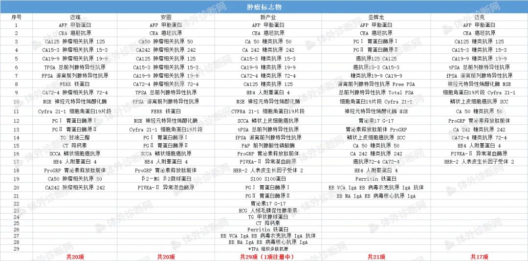 化学发光免疫分析技术是将具有高灵敏度的化学发光测定技术与高特异性的免疫反应相结合,用于各种抗原、半抗原、抗体、激素、酶、脂肪酸、维生素和药物等的检测分析技术。是继放免分析、酶免分析、荧光免疫分析和时间分辨荧光免疫分析之后发展起来的一项最新免疫测定技术,具有灵敏度高、检测快速、试剂稳定无生物毒性、易全自动等特点,成为免疫分析技术中最具发展前景的发光之一,在许多疾病的临床诊断中具有重大意义。 化学发光免疫分析法以标记方法的不同而分为两种: (1)化学发光标记免疫分析法 (2)酶标记、以化学发光底物作信号试剂的化学发光酶免疫分析法 国内发光大部分市场仍被进口品牌占据,《医药器械蓝皮书》显示,罗氏、雅培、贝克曼以及西门子为代表的进口品牌占据超过80%的市场份额,罗氏在化学发光诊断市场的占有率最高,达到35.5%。 可见,国产品牌想要在这一领域实现超越可谓是困难重重,但更大的挑战也意味着更大的机会。 第一,国内化学发光领域并未出现具有绝对垄断优势的头部企业; 第二,随着中国体外诊断行业的蓬勃发展和国产替代化浪潮的兴起,国产品牌的市场认可度、产品性价比都在不断提高; 第三,化学发光诊断项目众多,每一个细分项目所占份额十分接近,处于快速发展阶段,对想要进入这一领域的企业来说,有很大的发展空间。 图源:IVD Daily 因此,研发能力、技术水平与性价比兼备的企业,仍可以在这条黄金赛道上找到一席之地。 目前国内已有超过200家生产厂家获得化学发光注册证,上百家IVD企业也竞相涌入化学发光领域,根据国内的市场需求及时调整产品策略,竞争异常激烈。其中,被誉为“化学发光五虎”的迈瑞、安图,新产业、亚辉龙,迈克表现出强劲的实力和竞争力。 根据各家公司的官网信息,本文,小编将从肿标、性激素、甲功、贫血、代谢、感染、心肌标志物、传染性疾病、自身抗体等九个方面对“化学发光五虎”的主要项目进行统计,如有遗漏,欢迎留言,我们将随时进行补充! 肿瘤标志物 发光五虎在肿瘤标志物领域的获证情况呈现百花齐放态势,各家获证数量差距不大。 AFP、CEA、CA125、CA15-3、CA19-9、TPSA、FPSA、CA72-4、NSE、CYFRA 21-1、HE4、ProGRP、CA50、CA242基本各家都有;胃蛋白酶原ⅠPGⅠ、胃蛋白酶原ⅡPGⅡ、铁蛋白FERR目前迈瑞、安图、新产业、亚辉龙获证;PIVKA-Ⅱ 异常凝血酶原只有安图、新产业、迈克获证。 癌症一直是我国最大的民生健康问题之一。福建省医保局于去年年末带头将临床必需的肿瘤检测项目纳入医保,报销比例高达90%,体现了国家对肿瘤早筛的重视。在刚刚结束的上海肿瘤标志物大会上,与会专家也纷纷表示,肿瘤标志物技术目前虽然有了量的改变,但是仍任重而道远,早诊早筛仍有巨大发展空间。 未来,肿瘤标志物领域仍会是各大企业竞相争夺的化学发光市场,除了在“量”上的完善,更为重要的应该是“质”上的比拼了。 性激素 LH 促黄体生成素、PROG 孕酮、E2 雌二醇、AMH 抗缪勒氏管激素、人绒毛膜促性腺激素、泌乳素基本各家都有,在获证数量上,新产业、亚辉龙较多,分别为17项和16项,迈瑞12项,安图11项,迈克11项。 甲功 甲功方面,新产业获证最多,为14项。 FT4 游离甲状腺素、FT3 游离三碘甲状腺原氨酸、TG 甲状腺球蛋白、Anti-TG 抗甲状腺球蛋白抗体、Anti-TPO 抗甲状腺过氧化物酶抗体等常规标志物基本各家都有;PTH甲状旁腺素目前只有迈瑞、新产业获证。 贫血 贫血领域各家的铁蛋白试剂均获证,整体数量较少。 骨代谢&糖代谢 代谢领域,新产业发力最为强劲,获证项目有14项,骨代谢与糖代谢基本持平。 感染 安图在感染领域获证数量最多,为13项。PCT降钙素原最受企业青睐。 心肌标志物 心标市场向来是IVD企业竞相争夺的领地。新冠疫情发生以来,多项研究证实心肌损伤标志物的升高广泛存在于COVID-19感染者中,为迅速占领市场高地,把握后疫情红利,发光五虎对心肌标志物也是极为重视。 目前来看,新产业在心肌标志物领域一骑绝尘,获证项目有16项,其余四家在获证数量上差距不大。 传染性疾病 传染性疾病一直是全球面临的最严重的公共卫生问题之一。在该领域,新产业项目最多,为18项(7项注册中)。结核感染目前只有安图和迈克获证。 自身抗体 除了各家争相竞逐的第一大领域——肿标,最为大火的应该就是自身抗体。目前亚辉龙在该领域有43项产品获证,新产业也不甘示弱,拥有27个项目(4项注册中)。 当前,自身抗体的检测已经成为临床常规检测项目,据头豹研究院数据显示,自身抗体检测市场规模呈现逐年上升的态势,预计2023年市场规模可达22.3亿元人民币。这一前景巨大的蓝海市场正在吸引各IVD新老玩家加速入局,强势分羹。 图源:头豹研究院 今年两会期间,国家重点提到要强化基层卫生体系建设,部分地区已经响应号召加快推动县域医疗次中心建设,完善医疗设备配置,全自动化学发光仪器未来将会成为乡镇卫生院标配,这也是向IVD企业释放出的巨大信号,化学发光领域仍有巨大的市场缺口。 通观目前发光五小龙的化学发光试剂菜单,可以看到在品类上各家企业已经尽力做到了完善,每家企业的获证产品集中在肿标、性激素、甲功、心肌标志物、传染性疾病等五大领域,其余领域也有部分企业的少数产品获证。未来IVD企业想要在化学发光领域杀出重围,除了