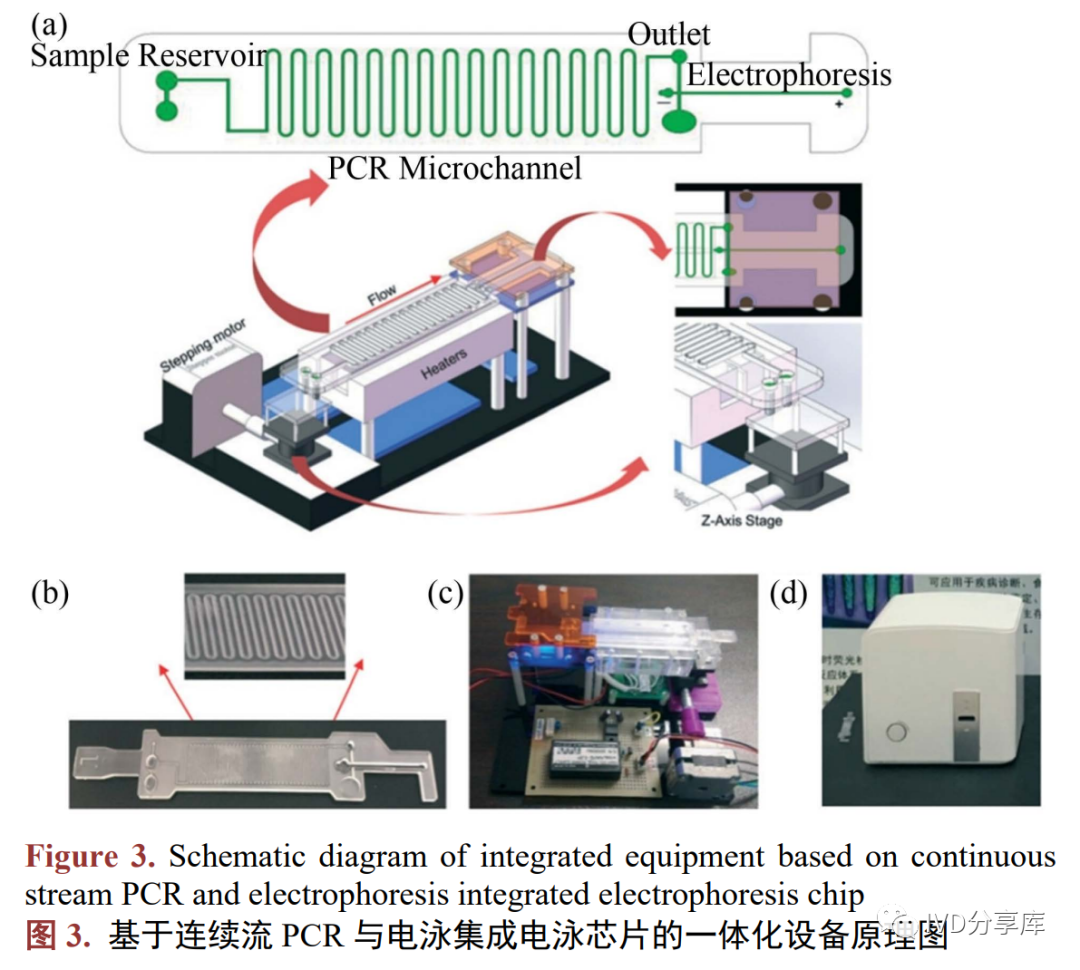 上,并在5分钟内扩增出了长度176 bp的目标基因。Jaehyun等人利用3D打印技术设计了一款低成本、快速成型的带有集成加热器的蛇纹石微通道PCR扩增装置。装置包括三个温度区,高温变性