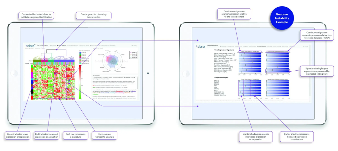 Almac Diagnostic Services公司专有的生物标志物发现软件claraT极具创新性。众所周知,对RNA-Seq基因表达数据的分析与解读是一项耗时且复杂的工作。Almac在全球率先简化了在肿瘤学中RNA数据的分析与解读,以帮助商业合作伙伴(制药企业、生物技术企业与学术界)通过claraT软件解决方案为其转化研究项目找到针对性的解决方案。简而言之,Almac开发的claraT是癌症研发人员首选工具。既可以确认该领域已知的发现,也可以在生物标志物的发现和转化研究过程中用于新的发现。Almac的claraT软件解决方案的最大亮点就是其开拓性的RNA-Seq数据分析与解读在癌症研究领域的应用。与传统方法相比,claraT生成报告的简洁性与易于分析性极大的提高了研究项目的速度与效率。claraT是定制软件解决方案。可以基于已经确立的“Hallmarks of Cancer”(癌症的特征)解读关于基因与生物学的信息。癌症的10个特征是癌症在人体内发展和进展的关键途径。这些信息是通过对单个患者样本进行测序获得的,该测序会产生大量复杂的RNA数据。claraT简化了这一过程,并可以生成可视化报告帮助癌症研究人员更好的理解生物学信息。Almac的claraT解决方案通过帮助癌症研究人员确认患者的亚组,改进对现有和新疗法的反应,最终帮助开发更好的癌症治疗方法。