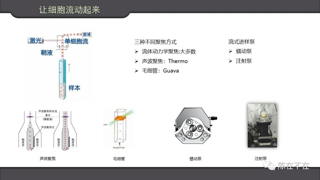 流式细胞,其必要条件就是让细胞流动起来。鞘液技术是目前的主流,除此之外有Guava的毛细管和Thermo Fisher的声波聚焦技术。