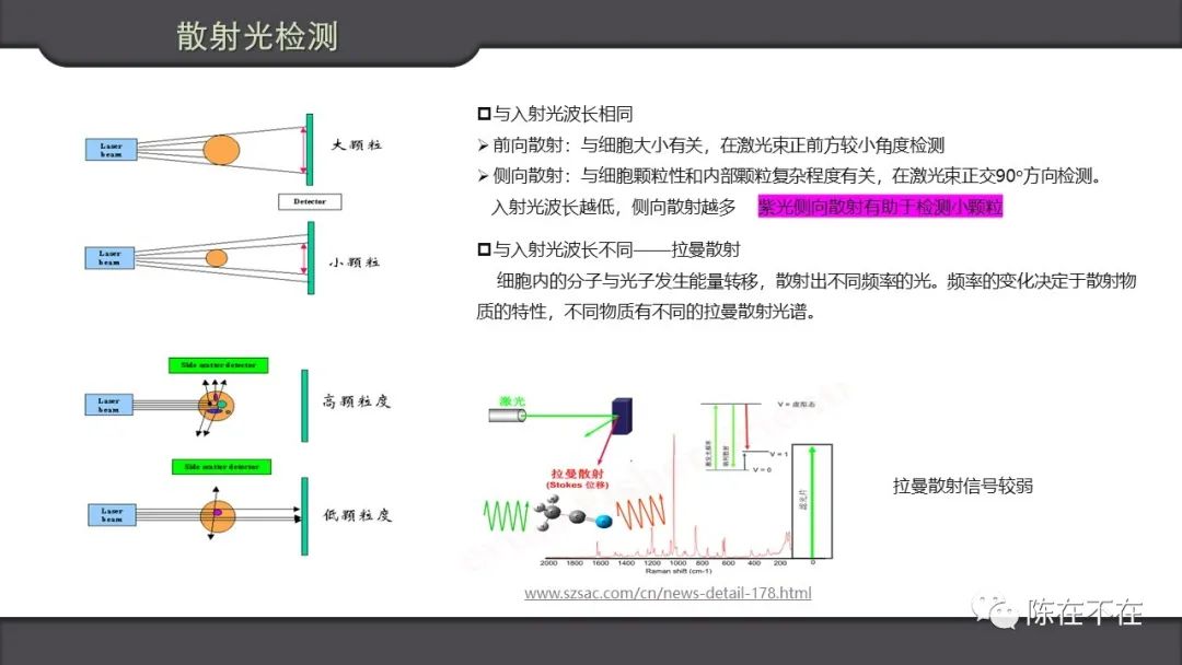 散射光反映颗粒物理性质。紫光侧向散射提高微小颗粒检测灵敏度,在不少机型中得以采用。近几年,拉曼散射检测在流式细胞仪中得以应用。不同物质有不同的拉曼散射光谱。要解决的问题是拉曼散射信号比较弱。