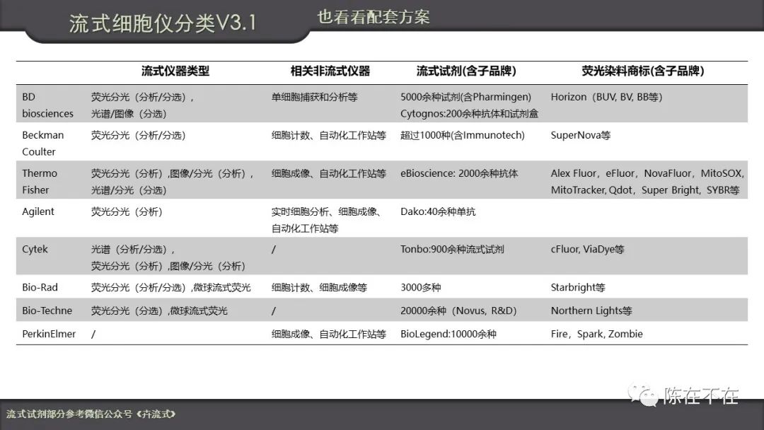 完整的解决方案还包括荧光抗体,以及染料等等。我们从这个角度再看看主要流式品牌的情况。