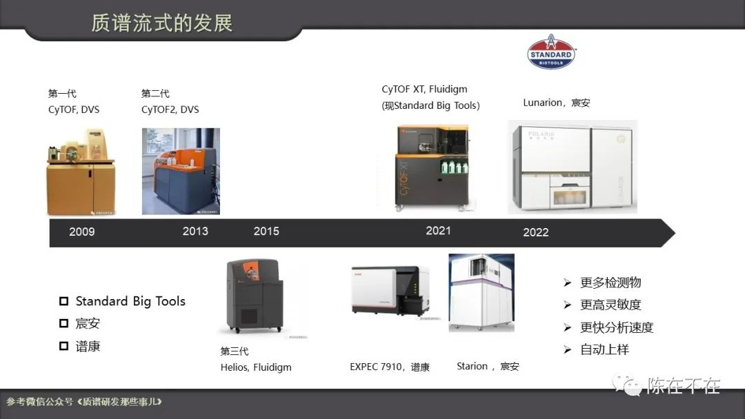 质谱流式方面,目前玩家有Standard Big Tools(就是Fluidigm),宸安,谱康,还有基于富鲁达仪器开发试剂的普罗亭等。发展趋势是更多检测物,更高灵敏度,更快分析速度以及自动上样。质谱流式首先是质谱,要把质谱这个活玩好,最早一代质谱流式的发明人也是来自于MDS Sciex质谱公司。其次,就是数据处理,解构后重建,挑战大也最有可能使之区别于其它流式。