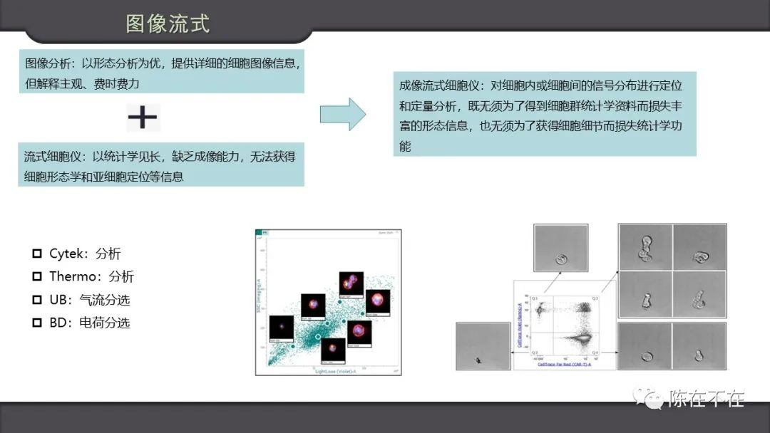 在荧光流式机器里面,有的附加了图像功能。这个领域,玩家有Cytek(收购了Amins),BD,Thermo Fisher和UB。引入图像的好处是获得了细胞形态学和亚细胞定位等信息,反过来难点也是,叠加大量图像信息的统计也不那么简单。