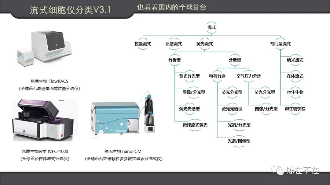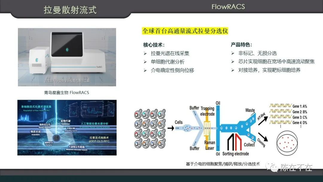 今天的流式细胞仪按照检测方式,可以分为荧光流式,质谱流式和拉曼流式。还有一些应用于专门流域的产品,如:检测纳米颗粒的纳米流式,量化分析体内循环细胞的在体流式,以及野外水下作业检测水生生物,微生物快检的产品。- 全球首台高通量流式拉曼分选仪 星赛生物 FlowRACS