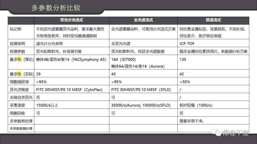言至于此,不管质谱分析还是光谱分析,以及传统的荧光分光流式选用更多激光更多通道,都是为了同时进行多参数分析。我们上个比较表。