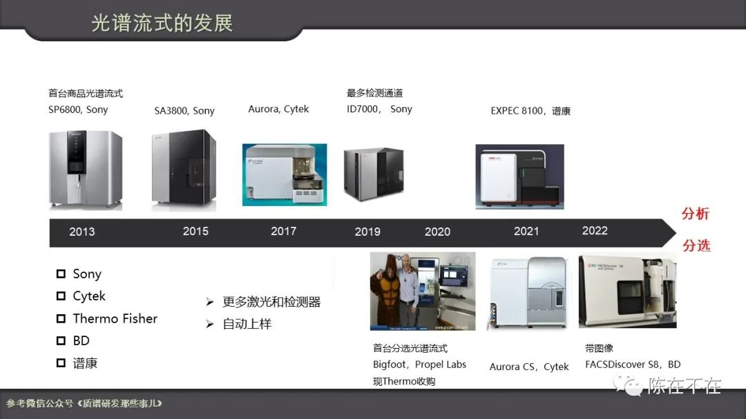 光谱流式以Sony推出第一代商品机来算,迄今也是十年。目前玩家主要有Sony, Cytek,Thermo Fisher,BD和谱康。