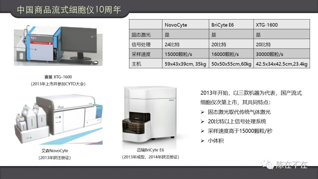2013年,苏州赛景公司XTG-1600上市并在Cyto大会上展出。同年,深圳迈瑞和杭州艾森都推出商品化流式仪,后者并于当年获得医疗器械注册证。所以,2013年对中国流式从业者来说具有里程碑的意义,由此到今,国产流式之路已经整整10年。
