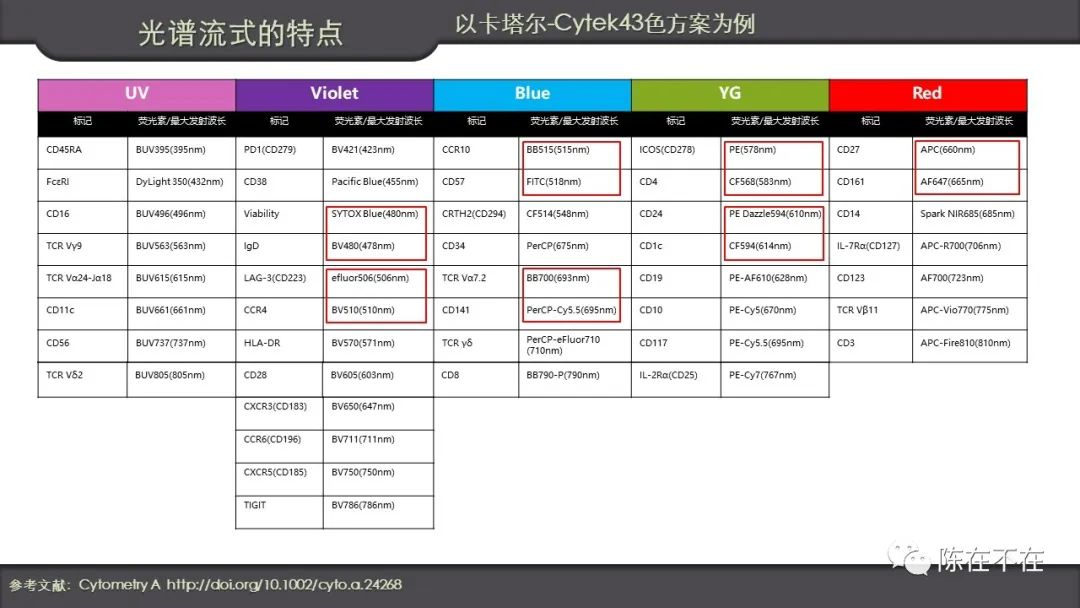 下图说明光谱流式的最大特点,红色框的几组荧光染料,最大激发波长几乎一样,荧光分光流式是不可能一起使用的,这样就大大扩宽了荧光染料的选择范围,同时分析参数自然增多了。