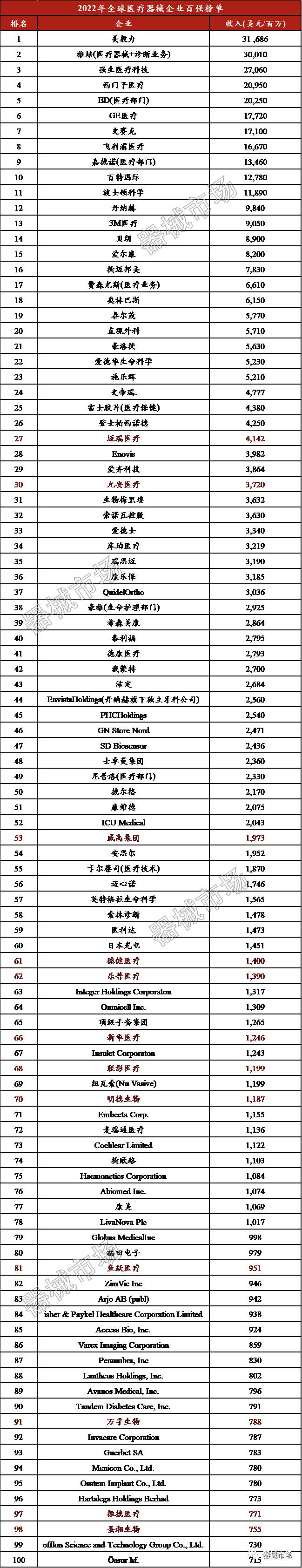 转载要求:请在文首标明文章来源,可直接转载 医疗器械行业的变化日新月异,新冠疫情和经济动荡也在影响全球医疗器械行业的每一家公司。 日前,医疗器械行业权威网站MD+DI QMED发布了2022年全球100强医疗器械企业榜单,让我们一起看看哪些公司经受住了风暴的考验并处于领先地位。 # 2022年全球TOP100医疗器械企业 该榜单根据各公司在医疗设备和产品领域的年销售额(以美元/百万计)进行排名,未将主要做经销的公司列入,具体排名如下。 说明: 1.雅培的数据仅统计医疗设备和诊断部门的销售额; 2.西门子医疗的数据仅统计医疗技术板块的销售额; 3 .Hoya(豪雅)的数据仅统计医疗保健部门的销售额; 4.Draegerwerk(德尔格)的数字仅反映了医疗部门的销售额。 据统计,本次入选百强的所有械企总年营收达到了4472.4亿美元。其中,全球医疗器械企业TOP10排名变动幅度较大; 美敦力雄踞榜首,雅培、强生、西门子医疗、BD、GE医疗、史赛克、皇家飞利浦、嘉德诺、百特分列第2至10名; 其中,美敦力、雅培、强生医疗科技排名前三; ·美敦力以316.86亿美元年营收依旧高居榜首; ·雅培(医疗器械+诊断业务)受新冠检测业务提升等影响,以300.1亿美元年营收,排名一跃从全球第九跃升至全球第二; ·强生医疗科技排名全球第三,西门子医疗排名全球第四; 排名变动最大的除了雅培(医疗器械+诊断业务),就是飞利浦医疗。 受到呼吸机召回、供应链、通胀、汇率等不利影响,飞利浦医疗2022年营收增长仅为+3%,调整后息税前净利润-43%。其排名从全球第四下滑至全球第八。 然而,上述国产企业名单排名,部分受到疫情影响较为明显。 《中国医疗器械行业发展现状与趋势》报告显示,2022年中国医疗器械市场规模预计达9582亿元(人民币,下同),近7年复合增速约17.5%,已跃升为全球第二大市场。 市场规模庞大,展望2023年的营业收入,国产企业上榜名单相信也会有较大变化。 尤其是该榜单基于年销售额来进行排名,具有综合性业务布局的国产创新医疗器械企业有望在名单上更进一步。 |