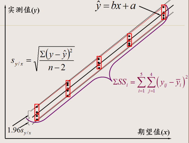 介绍CLSI EP6-P文件/ 定量检验线性性能评价 冯 仁 丰 病人结果检测范围,也即方法或检测系统的线性范围。 评价实验要求 1、进行检测范围实验的样品必须和真实样品尽可能相似,也即要和真实样品具相同的基质状态。 2、最好有5个或以上的系列浓度的实验样品,浓度范围遍布整个检测范围。最高浓度的样品应达到检测范围的上限。各实验样品内含分析物浓度间呈等比例关系,不要呈倍比关系。 3、加入的“浓储存液”体积不超过十分之一。 5L、4L+1H、3L+2H、2L+3H、1L+4H、5H 4. 每个样品至少作4次重复测定。 统计处理 1、若有5个浓度,每个浓度进行4次测定,则将所有20对(x,y)结果点于坐标纸上,观察有无线性表现。有线性的进行直线回归处理。 2、不取均值,直接对20对结果作回归处理。 3、直线回归式: 预期值为x,实测值为y。 为回归线上在对应x下的y值。 理想状态:b=1,a=0; 问题:绘制的回归线是作直线回归处理,所以画出来的线是直线。但是,实验结果是否能被确认,各个浓度间确实具有良好的线性关系,这才是最真实的。EP6-P就是用于判断线性的文件。 图1:线性评价中的直线回归 EP6-P文件基本原理 一、统计上评价线性的意义 EP6-P对线性数据处理的依据:线性数据的直线回归表现。 图2:线性评价中回归直线的意义 图3:线性评价的各组数据重复检测值的方差 进行回归处理的前提: 对实验数据的可靠性进行核查。 第一,各实验样品的重复数据中有无离群点; 第二,各实验样品重复数据组间的方差大小是否比较一致,即:是否某组的方差较其他组的方差大得多;若是这样,那么非线性不一定是真实的,是实验操作不精密度差所致。只有这两方面都符合要求,才可进行线性的统计检验。 图4:EP6-P线性评价5组样品重复检测结果的方差表现。 线性实验的总方差 线性实验的总方差反映了实验的总不精密度: 注:按照EP6-P线性评价实验方案,共有5个样品(i=5);每个样品进行了4次重复检测,j=4。 图5:线性评价实验数据点的方差 图6:线性评价实验数据点方差与回归直线的关系。 检测范围表现为直线时,各组数据实验具有的总方差(不精密度)为: 这些数据直线回归处理,所有实验点对于线的离散方差为: 由图说明,回归配合后引入的误差估计量,基本上就是由各组点的不精密度量总和ΣSS组成。 在EP6-P线性评价中,令这二者的差为“线性失拟误差(Lack of Fit,LOF)”。 求方差: (注:式中TE即ΣSS) 当实验结果呈线性表现时,LOF很小,它与自由度相除后,与ΣSS被自由度相除后的比值(F)将小于F0.05;由此,EP6-P文件判断实验结果为线性。 EP6-P对非线性数据处理的依据 非线性数据的直线回归表现: 图7:线性评价非线性的表现 图8:线性评价非线性的分析 非线性时的表现 上图说明:实验中各组数据的总不精密度依然与前线性表现时一致。 但是,非线性表现的各组数据点,仍然作直线回归处理时,为了顾及所有点的回归线,大大增加了所有各组数据点对于线的离散程度。 求方差: 当实验结果呈非线性表现时,LOF很大,它与ΣSS比值(F)将大于F0.05或F0.01;由此,EP6-P文件判断实验结果为非线性。 扫描二维码 获取配套视频 转载请注明出处 微信公众号:冯仁丰 |