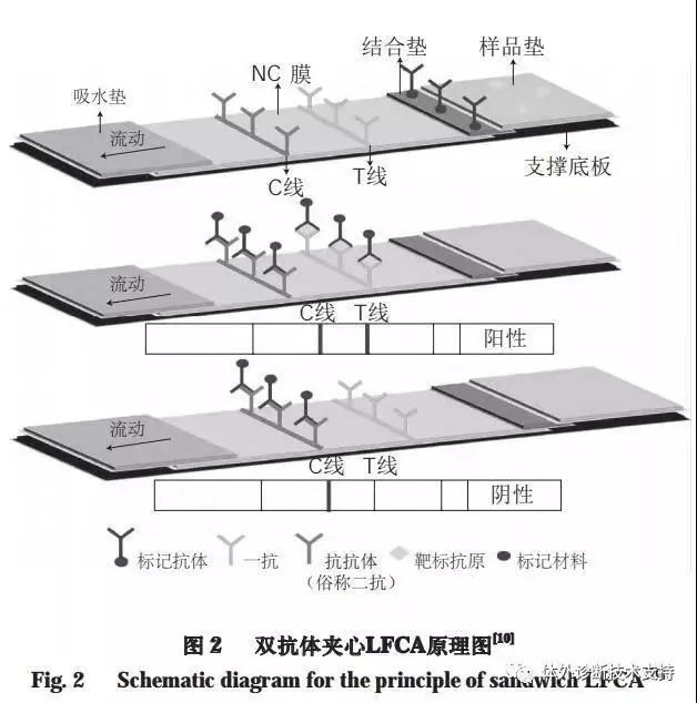 01、LFCA的技术原理及设计 LFCA由4 个部分组成,即样品垫、结合垫、层析膜和吸水垫,将这4 个部分叠加于支撑底板上就构成了一个简易的LFCA试纸条(图1)。样品垫为经过处理的纤维膜或玻璃棉,用于快速吸收待检样品,使其利用毛细管作用向结合垫方向侧向流动。结合垫为纤维膜或玻璃棉,吸附有标记的生物活性材料(如金标抗体),它可与待检样品溶液里的检测靶标结合形成肉眼可见的免疫复合物。层析膜大都为硝酸纤维素(nitrocellulose,NC)膜,它是LFCA的关键材料,为分析物之间的反应提供了平台,其上固定有两条或多条不同生物活性物质(如抗原或抗体)喷印的“检测(test,T)线”和“质控(control,C)线”,用于拦截带标记的免疫复合物,并可直观地显示检测结果。吸水垫为吸水纸板,用于吸收流过层析膜的待检样品,以平衡层析膜两边的压差,促使更多待检样品在层析膜上侧向流动。