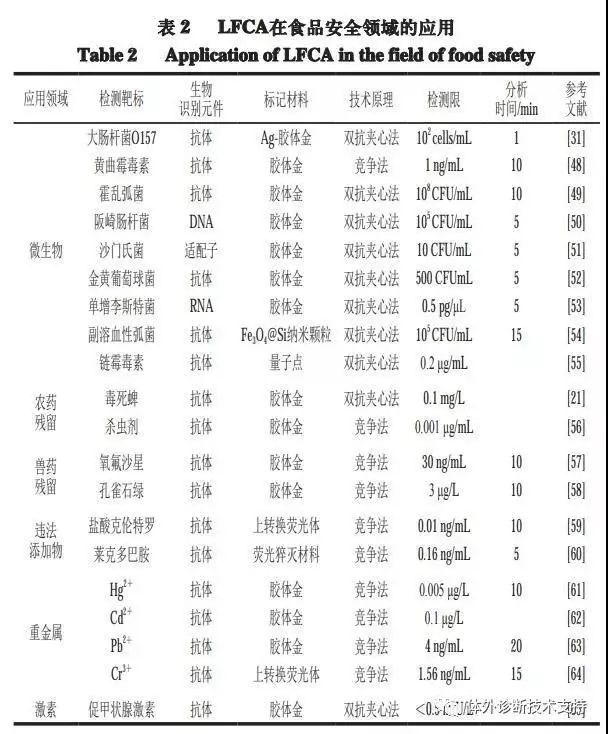 目前,“从农田到餐桌”的食品安全问题日益复杂化,食品安全问题频发。病原微生物造成人体食物中毒,农兽药滥用处于无序状态,重金属超标构成粮食产品安全隐患,违法添加、掺杂掺假现象报道此起彼伏,食品安全已经成为困扰人民健康生活的大问题。为响应人民的需求,方便快速、低成本、节省时间、结果肉眼可见的LFCA已在包括食源性致病菌、农兽药残留、违禁添加剂、生物毒素、重金属离子检测等领域被越来越多的应用。 由表2可见,现阶段LFCA在食品安全领域应用甚广,主要应用于食源性致病菌和农兽药残留检测两大方面。对微生物检测主要以双抗夹心法为主,而在农兽药残留检测领域大都采用竞争法。这些方法中胶体金作为标记材料的应用非常广泛,为了提高灵敏度,近年来对一些新型标记材料的应用也有很多研究,比如量子点、磁性纳米颗粒、上转换荧光材料等。LFCA法对微生物的检测限高达10~108 CFU/mL,农兽药残留的检测限高达30 ng/mL~0.1 mg/L,检测时间缩短至1~20 min。