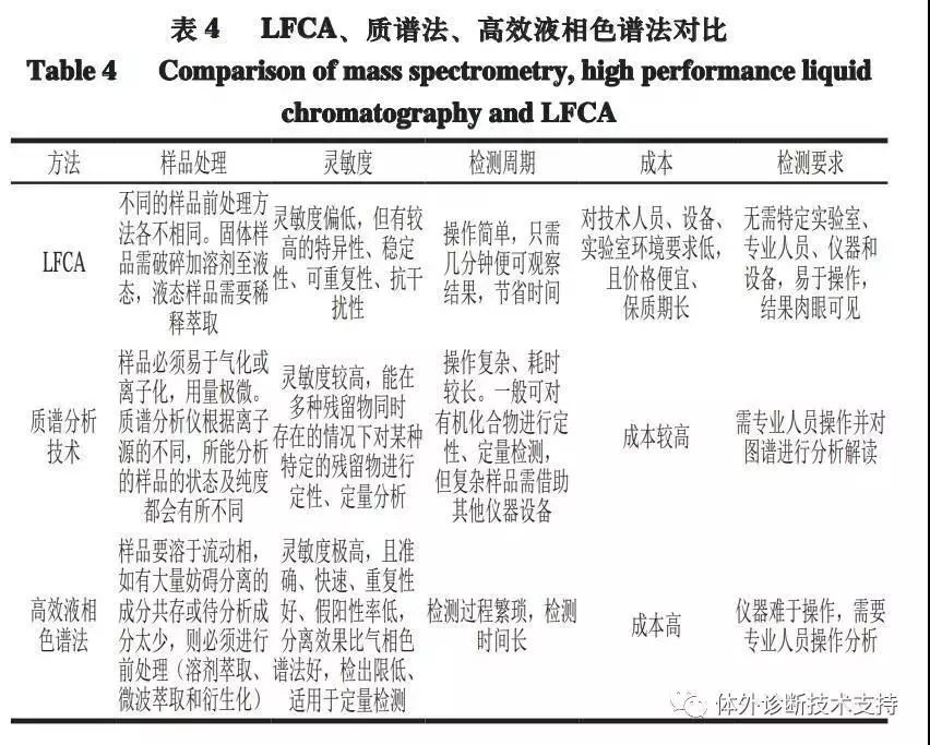 目前,在检测农、兽药以及重金属残留方面应用较广的是色谱法和质谱法等相关检测方法,其中色谱法又包括气相色谱法、高效液相色谱法,高效液相色谱技术更为先进。同时,气相色谱-质谱联用技术将气相色谱仪与质谱仪通过适当的接口相结合,借助计算机技术进行联用分析,发展成熟,成为复杂组分分离和鉴定的有效方法。表4从样品前处理、灵敏度、检测周期、成本和检测要求5 方面以质谱法和高效液相色谱法作为代表与LFCA作比较分析。分析表明,LFCA相较仪器分析化学技术,虽然检测灵敏度低且不能进行定量分析,但其所需成本低、对技术人员要求不高、检测时间短。因此,可以用LFCA法作为一种初筛手段,对阳性结果进一步使用仪器分析法得到准确数值。也可通过借助一些数据读取设备对LFCA法进行半定量分析。