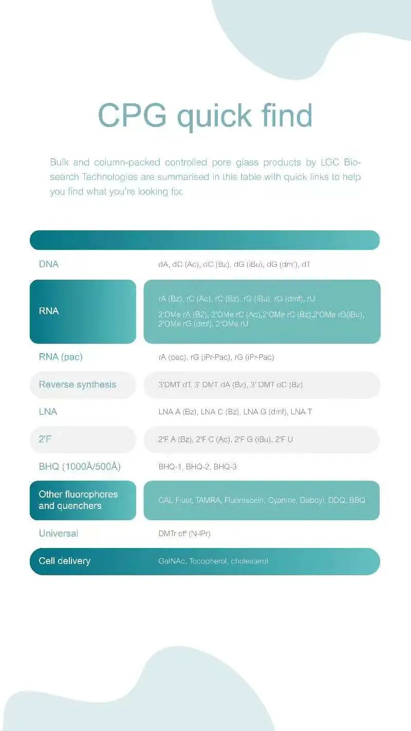 为何固相载体品质是降低寡核苷酸合成成本 和确保高质量产物的重要因素? CPG CPG Column 我们的可控孔径玻璃经过先进的生产工艺精制, 通过优化控制粒径、形状、孔径、孔体积和比表面积, 最大化您的核酸纯度和得率。 CPG Bulk CPG 诊断及治疗应用领域的 最佳拍档 一般来说,在治疗应用领域的大规模核酸合成需要500-600Å孔径的高载量CPG,而对于诊断或研究用途的中小规模合成需要更大孔径,例如: rA (Bz), 2'-OMe CNA 600 Å CPG rC (Ac), 2'-OMe CNA 600 Å CPG rG (iBu), 2'-OMe CNA 600 Å CPG rU, 2'-OMe CNA 600 Å CPG “我们在Steinach完成了提升人们生命健康质量药物开发的第一步。这些药物是基于合成的寡核苷酸,而我们的可控孔径玻璃(CPG)是寡核苷酸合成的关键起点。即使我们不是自己生产药物,我们也有义务提供这样高质量的产品。这就是为什么我们在最佳生产工艺的基础上生产出最佳的CPG。" —— Jan Schönherr LGC基因组学CPG工艺部门技术运营组组长 值得信赖的 高品质固相载体 我们遵循ISO9001质量制造标准,为您提供可靠、稳固的产品。让您的产品能够以最少的杂质和最高的安全水平进行生产。 为最优的 安全性能而造 LGC Biosearch Technologies 的 CPG 产品是诊疗市场内所有细分领域里所使用的金标准固相载体。 本着与客户共同携手合作的流程与宗旨,我们致力于制造适用于合成当下各类核酸的固相载体,包括: siRNA LNA 递送增强脂质配体 用于CRISPR的向导RNA(sgRNA) 选择合适的 固相载体 LGC可提供多种孔径、功能化修饰和载量的CPG固相载体。从500Å到3000Å的六种不同孔径使合成的寡核苷酸几乎能够适用于任何应用。