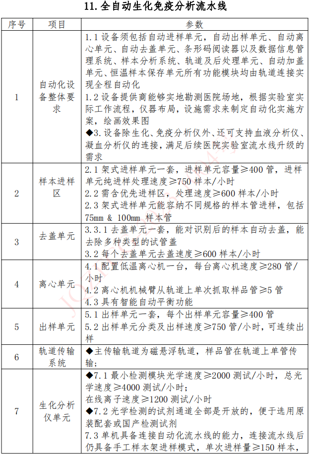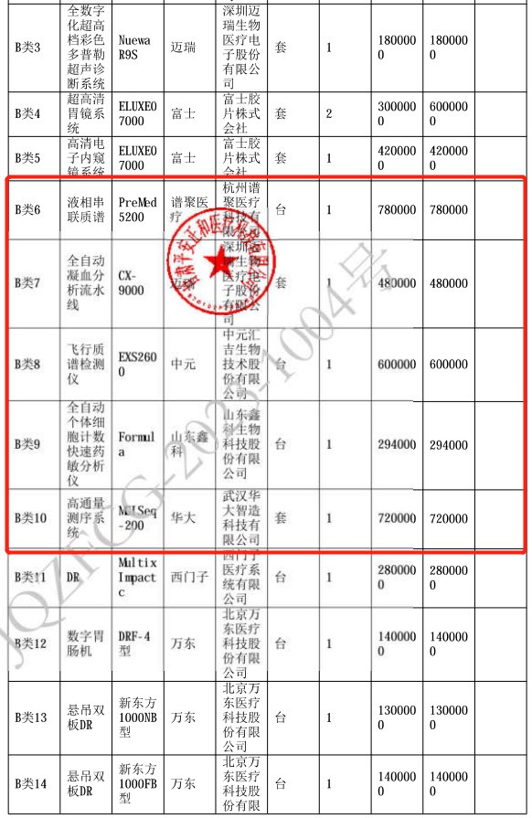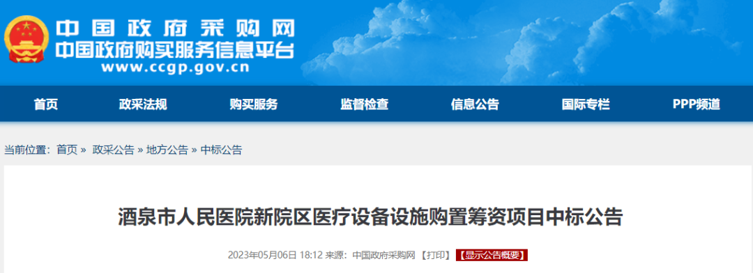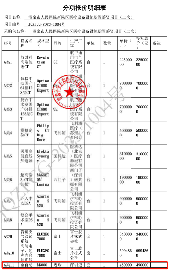 2023年5月6日,中国政府采购网发布信息,酒泉市人民医院新院区医疗设备设施购置筹资项目中标公告。其中标金额高达3.49亿! 一、项目编号 JQZFCG-2023-1004号 二、项目名称 酒泉市人民医院新院区医疗设备设施购置筹资项目 三、中标(成交)信息 供应商名称:甘肃平安正和医疗科技有限公司、平安点创国际融资租赁有限公司 中标金额(万元):34923.989万元 六、代理服务收费标准及金额 收费标准:按中华人民共和国国家计划委员会发布的《招标代理服务收费管理暂行办法》(计价格[2002]1980号),在标准取费的基础上下浮10%收取。 收费金额:49.37万元 根据公布的信息,此次招标中标金额3.49亿元,中标服务费达到49.37万元,创历史新高。 根据招标文件,酒泉市人民医院新院区医疗设备购置为二次招标 一、项目基本情况: 项目编号:JQZFCG-2023-1004号 项目名称:酒泉市人民医院新院区医疗设备设施购置筹资项目(二次) 预算金额:349247430元(人民币) 大写:叁亿肆仟玖佰贰拾肆万柒仟肆佰叁拾元整人民币 最高限价:349247430元(人民币) 采购需求:酒泉市人民医院新院区设备配置、总务后勤物资配置及安防设备配置(具体内容详见招标内容) 合同履行期限:详见《招标文件》 本项目接受联合体投标: 本项目接受联合体投标,以联合体投标的,组成联合体的成员数量上限为2家。联合体投标的,鼓励联合体由设备供应商和融资公司组成。联合体各方在同一招标项目中以自己名义单独投标或者参加其他联合体投标的,相关投标均无效。(具体要求详见招标文件) 酒泉市人民医院新院区计划2023年8月开始搬迁。新院区所需医疗设备、总务后勤设备(物资)、安防设备等需同步配置到位。为了保证新院区如期投入运行,为人民群众提供更优质高效的医疗服务,现通过招标方式确定设备供应商,向医院提供预算总价为34924.743万元的医疗设备、总务后勤设备(物资)及安防设备等。 鉴于项目所需资金较大,鼓励融资公司参与项目投标,投标人可由联合体(设备供应商牵头并联合融资公司组成联合体)参与本项目投标。医院分8年32期向中标人等额支付项目资金,医院不承担中标人项目资金产生的利息及相关费用。 1.投标人在制作投标文件第 7 项“招标内容及技术规格偏离表”时,内容填写为“具体内容详见附表 7.1-7.5”。 备注: (1)配置清单内推荐的品牌,仅作为投标参考,不作为中标条件。 (2)备注栏注明“国产”的产品不接受投标人选用进口产品参与投标; 注明“进口”的产品允许投标人选用进口产品参与投标,但不排斥国内产品。 (3)进口产品是指通过海关验放进入中国境内且产自关境外的产品。即所谓进口产品是指制造过程均在国外,如果产品在国内组装,其中的零部件(包括核心部件)是进口产品,则应当视为非进口产品。采用“进口”的产品优先采购向我国企业转让技术、与我国企业签订消化吸收再创新方案的供应商的进口产品,相关内容以财库〔2007〕119 号文和财办库〔2008〕248 号文的相关规定为准。 针对生化免疫流水线: 1、样本进样区 架式进样单元一套,进样单元容量≥400管,进样单元纯进样处理速度≥750样本/小时; 需含优先进样区,处理速度≥600样本/小时; 架式进样单元能容纳不同规格的样本管进样,包括75mm&100mm样本管; 2、去盖单元 去盖单元一套,能对识别后的样本自动去盖,能去除多种类型的试管盖; 每个去盖单元去盖速度≥600样本/小时; 3、离心单元 配置低温离心机一台,每台离心机速度≥280管/小时; 离心机机械臂从轨道上单次抓取样品管≥5管; 具有智能自动平衡功能; 4、出样单元 出样单元一套,每个出样单元容量≥400管; 出样单元分类及出样速度≥750管/小时,可连续出样; 5、轨道传输系统 ◆主传输轨道为磁悬浮轨道,样品管在轨道上单管传输; 生化模块:最小检测模块光学速度≥2000测试/小时,总光学速度≥4000测试/小时;在线离子速度≥1200测试/小时; 发光模块:单机或单模块最大测试速度≥500测试/小时,总测试速度≥1000 测试/小时; 生化免疫流水线迈瑞中标,M6000,中标金额450万元;血液分析流水线迈瑞中标,CAL8000,中标金额100万;检验科装修,中标金额500万元。 由于数量较多,不一一列举,但从粗略统计来看,迈瑞是此次的大赢家,统计表来看,迈瑞中标38项,总金额4000万以上。 从中标来看,此次招标,大型设备依然被进口厂家垄断,就检验设备来看,国产占据主流,其中流水线和部分单机,基本能实现国产替代。 本项目详细中标文件 请扫描下方二维码查看 |