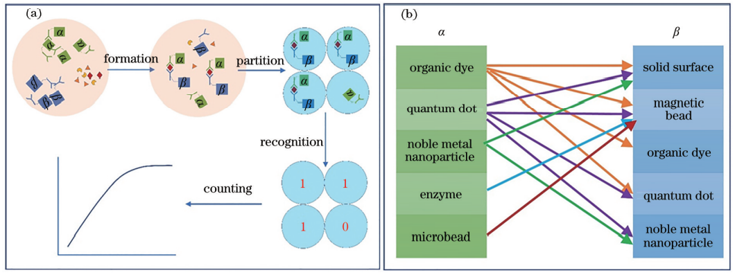 图 1 数字免疫分析。(a)一般流程;(b)偶联标记分类组合