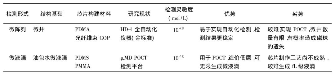 基于微阵列芯片和微液滴的单分子免疫检测技术的检测灵敏度均可达到 10-18mol / L,二者各具优势和不足( 表 1) 。微阵列技术已经实现全自动检测和商业化,但其成本较高,难以实现床旁检测,而微液滴技术更适合床旁检测,但芯片制作工艺尚不成熟,有待进一步发展。
