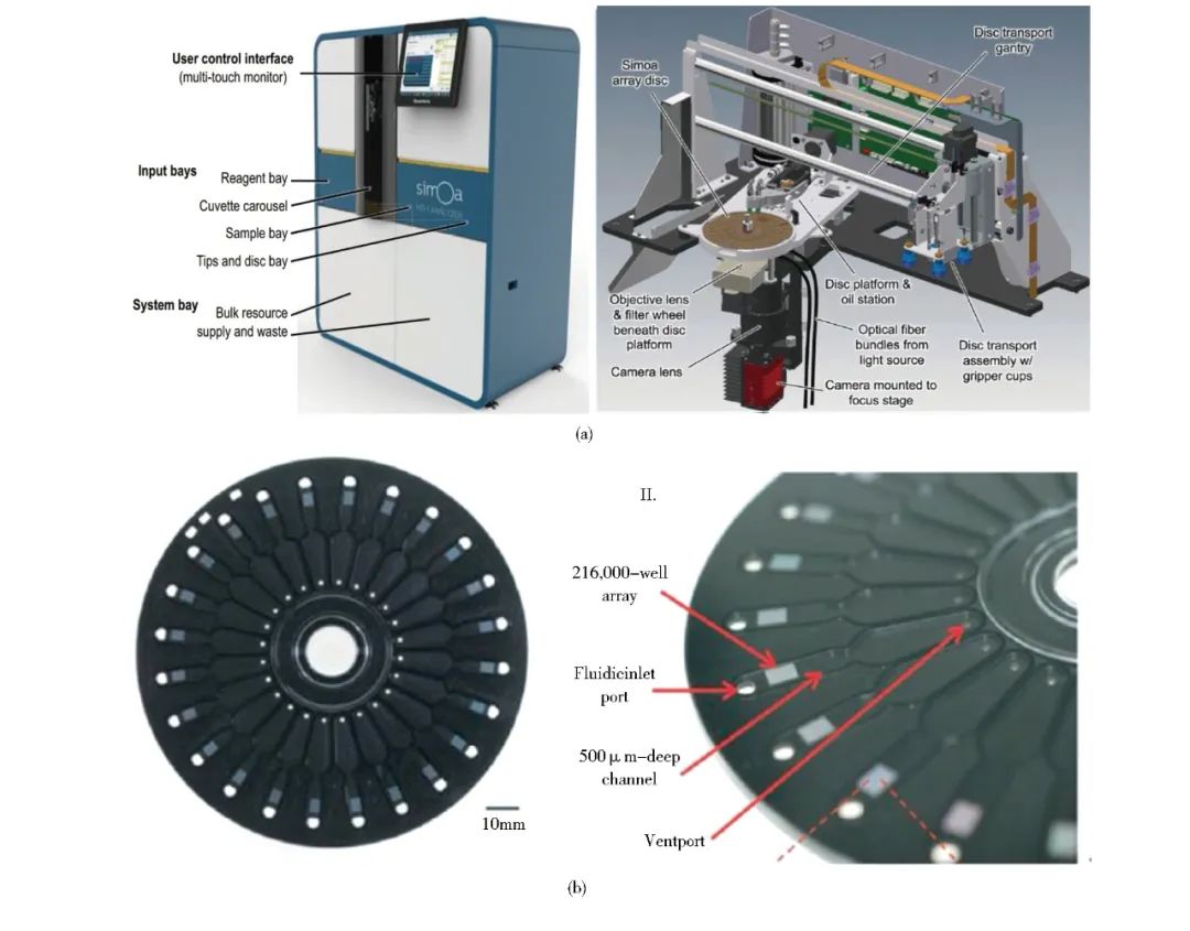 2012 年,Kan 等基于环孔聚合物研发出具有 216 000 个微孔的芯片 ( 图1a) ,每孔体积 50 fL 左右,且将 24 个这样的芯片整合至一张 DVD 式圆盘上( 图2b) ,同时添加微流道和进出口,实现了检测的高通量及自动化,这是单分子免疫检测从实验室到临床应用的一大飞跃。目前该 DVD 式圆盘芯片已实现量产并应用于 Quanterix 公司的 SimoA HD-1 分析仪,图2a。与普通化学发光法或 Elisa 法相比,可将检测灵敏度提高 2 ~ 3 个数量级。Quanterix 公司将全自动检测仪器 HD-1进入市场并开始应用,该仪器可在一小时内完成 66份样本检测,且可平行测定10种不同靶标,目前已成为数字免疫检测的金标准。