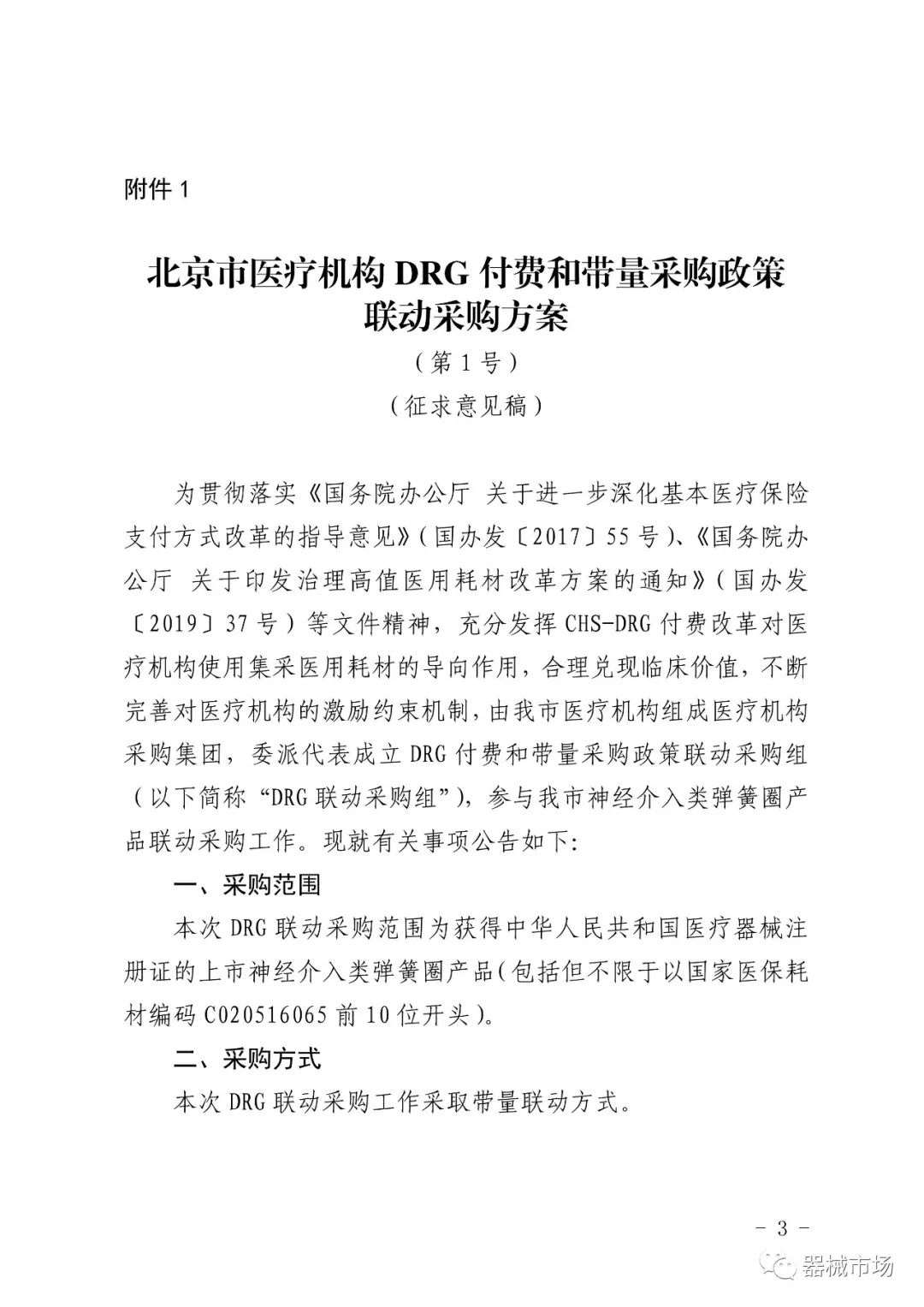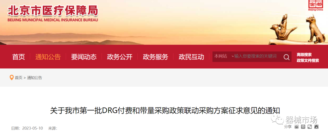 转载要求:请在文首标明文章来源,可直接转载 2023年5月10日,北京市医保局发布了《关于我市第一批 DRG 付费和带量采购政策联动采购方案征求意见的通知》。(以下简称《通知》,文末附全文) 由北京市医疗机构组成医疗机构DRG联动采购集团,针对运动医学类、神经介入类、电生理类医用耗材制定了DRG付费和带量采购政策联动采购方案。 《通知》指出,为充分发挥CHS-DRG付费改革对医疗机构使用集采医用耗材的导向作用,不断完善对医疗机构的激励约束机制,制定了此方案。 发布机构为北京六家顶级三甲医院: 首都医科大学附属北京安贞医院、北京积水潭医院、首都医科大学附属北京天坛医院、中国医学科学院阜外医院、北京大学第三医院、首都医科大学宣武医院 三类耗材采购周期均为1年,如有其他省级(省际联盟)同类产品带量采购中选结果产生,则就低联动执行。意见征求时间截止至2023年5月14日。