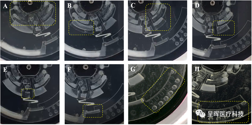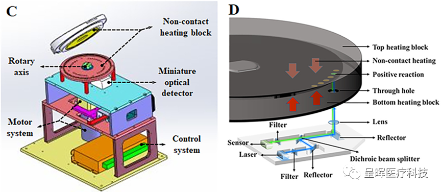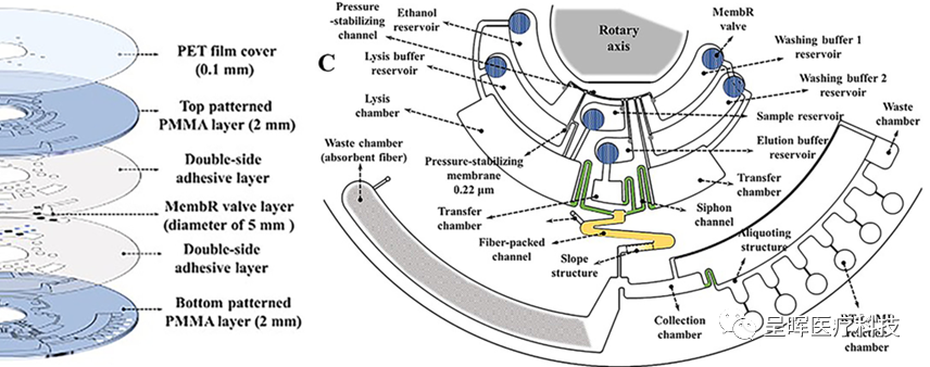 本文展示一种基于膜阻阀和LAMP扩增技术实现的离心微流控全自动核酸分析系统。一、高致病性禽流感病毒提取检测所谓的膜阻阀,就是通过利用亲疏水性质不同的超细孔径穿孔的聚碳酸酯薄膜叠加组成的,因此能够在不同压力的作用下突破。试验仪器原理构造如图 1所示,其包括电机系统,温度控制系统(采用非接触式热空气加热方式,包含一种导热底板,其表面覆盖有导热盖,形成封闭的加热腔,几个集成在底板和盖子的加热元件,以及两个用于反馈腔温的PT100传感器),光学检测系统(包含荧光检测模块,使用发光二极管作为光源,488nm的过滤器,透镜,二色分束器,两个反射器和一个光检器装载在55×45×10 mm的盒子内),以及一个控制系统(用于加热元件温度控制,旋转轴转速控制,光源强度调节,数据采集,电源管理,与用户电脑的无线通讯)。 图 1.仪器构造图 所用芯片的直径为100mm,由上至下包含三层结构(如图 2所示):0.1 mm的PET 自粘性胶带,2mm的PMMA顶板(仅包含主体腔室结构,不包括管路和扩增结构),膜阻阀层,2mm的PMMA底板(主要包括所有扩增结构和管路,裂解腔和输送腔,以及膜阻阀出口结构)。芯片包含五个液体储存腔(除储存乙醇的腔室外,均用于长期储存液体试剂),以及位于顶部中间位置的样本腔。芯片所用裂解液(85uL),清洗液1(32.8uL,无乙醇),清洗液2(23uL,无乙醇),洗脱液(30uL)均源自德国凯杰公司的标准试剂盒。实验前,在乙醇腔,清洗液1腔,清洗液2腔加入适量乙醇完成试剂配制即可。 图 2. 芯片层间结构 膜阻阀层采用12层5mm直径的聚碳酸酯膜构成阻力层(位于腔室和流出管路的交叉点位置),12层2mm直径的0.22um孔径的疏水聚碳酸酯膜作为稳压层(位于气路和储液腔室的交界处)。聚碳酸酯膜采用表面疏水处理(Scotchguard, 3M, USA)制作疏水膜,与其未改性的膜叠加组成膜阻阀,孔径为12~0.4μm。膜夹在两层双面胶(3M 9454-300LS, 3 M,USA)之间,为了防止膜被双面胶堵塞,因此在两张双面胶上开有3mm的孔作为出口。当液体接触膜阻阀时,润湿膜上的微孔产生反压,防止液体通过小孔,使阀门的初始状态关闭,当离心压力超过破裂压力时,则可以开启膜阻阀(具体压力值的计算参考文献)。芯片内部的4个虹吸阀采用亲水试剂Vistex 111-50(FSI Coating Technologies, USA)处理,虹吸阀的宽度0.4mm,深度为0.1mm(有效防止之前储液腔内的残余试剂在后续实验步骤的高速条件时漏出进入提取管道,影响提取效果)。芯片的RNA提取膜事先磨碎,用焦碳酸二乙酯(DEPC)处理的水重悬,然后加入至芯片的提取通道内(尾部有100um深度的堰结构防止提取膜流出),通过离心的方式干燥。废液腔内填充吸水性纤维,以防止废液回流。分发腔和PCR扩增腔连接的毛细阀宽度为0.15mm,深度为0.075mm。 6个PCR扩增腔室分别放置H1N1,H3N2,H7N3,H7N9,H9N2扩增试剂,用于检测流感病毒的五种亚型,具体的检测原理见文献相关内容。 二、检测逻辑 1. 如图 3A所示,在实验开始前,将85uL的无水乙醇加入至乙醇腔中,另外加入43.2uL乙醇至清洗液1腔,以及53uL乙醇至清洗液2腔中,最后在样本腔加入40uL左右的样本,对芯片的所有加样口进行密封; 图 3. 芯片检测流程 2. 如图 3B所示,首先逆时针500rpm转动,持续20s,使裂解液和样本突破膜阻阀进入裂解腔,随后维持转速状态10min,使样本充分裂解,释放RNA; 3. 随后,增加转速至1000rpm,使乙醇突破膜阻阀进入裂解腔,混合1min用于沉淀RNA; 4. 如图 3C所示,停止芯片,使裂解腔中的混合液进入虹吸阀顶部,然后增加转速至2000rpm,使包含RNA的裂解混合液突破虹吸阀,进入提取管道,RNA与管道中的膜纤维吸附,废液进入左侧的废液腔,同时清洗液1突破膜阻阀进入输送腔中; 5. 使用相同方法使清洗液1突破虹吸阀,清洗提取管道中残留的盐离子和蛋白质; 6. 如图 3D&E所示,增加转速至2750rpm,使清洗液2突破膜阻阀,随后使用相同方法突破虹吸阀,并增加转速至4750rpm,持续3min,使清洗管道中的乙醇完全流尽,同时洗脱液突破膜阻阀进入另一输送腔中; 7. 随后将低转速使洗脱液通过虹吸阀顶部,然后顺时针增加转速至500rpm,持续3min,使洗脱液充分浸润提取管道,同时升温至42℃,使PCR扩增腔内的扩增试剂胶状物熔化,释放试剂; 8. 如图 3F所示,增加转速至5000rpm,使洗脱RNA的洗脱液进入收集腔中; 9. 如图 3G所示,停止芯片然后增加转速至1200rpm,使洗脱液通过虹吸阀进入右侧的分发腔,多余的废液进入分发腔末端的废液腔中; 10. 如图 3H所示,增加芯片转速至5000rpm,使6个分发腔内的液体进入PCR扩增腔,和扩增腔内的扩增试剂混合,扩增体积为12.5uL; 11. 升温至63℃,开始RT-LAMP扩增; 参考文献:[1] Liu Q, Zhang X, Chen L, et al. A sample-to-answer labdisc platform 转载请在24小时之后。 (编者注:深圳市呈晖医疗科技有限公司是深圳市刚竹医疗科技有限公司全资子公司。呈晖医疗团队一直以来专注于研发基于微流控的全自动核酸检测系统,以解决当前核酸检测的痛点。注册此公众号主要分享团队对于微流控技术以及IVD行业的认识,欢迎关注。) |
