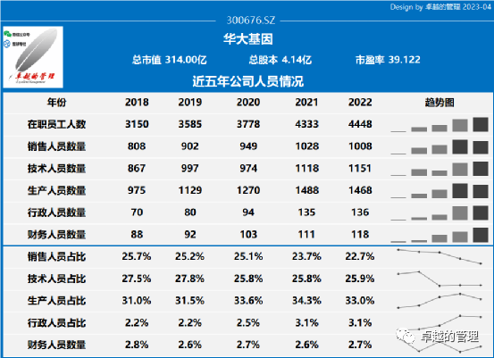六、董监高人员 华大基因的董监高总计20人,最引人注目的就是董事长和副董事长的税前报酬总额是0。不过他们倆主要还是通过持股,分别是2,537,800股和1,064,000股,结合华大基因的分红每10股派发现金股利 3.50 元(含税),即分红分别为88.8万元和37.2万元。另外,作为公众聚焦人物,特别是尹总,经常做客各种访谈,华大分红只不过是九牛一毛吧(*/ω\*)。水管子粗了,随便拿个桶都能接满,水管子细,打一碗水都要半天。另外,高管团队学历都比较高,专业程度也比较高,当然薪酬普遍都在150-250万之前。 公司报告期内董事、监事和高级管理人员报酬情况 七、公司人员 查看公司近五年人员情况,人员持续上升,但是2022年销售人员流失20人,而且销售人员占比近五年出现持续下降趋势,技术人员逐年增加,但是占比从之前28%降到26%。生产人员和行政人员增长趋势最为明显。 在人员薪酬方面,横向对比了2022年51家医疗服务上市公司人均薪酬,已公布年报的企业中,华大基因以36.35万的人均薪酬排名第1位。通过查看具体三费内容可知,销售人均薪酬=494,833,651.97/1008=49.1万,研发人员薪酬=267,700,291.12/799=33.5万,管理人员费用= 205,538,637.57/606=33.9万。 八、经营计划 2023 年,公司将依托“火眼”实验室建立起来的平台和能力,持续转化为生育健康、肿瘤防控、感染防控、慢病防控等全生命周期的医学检测服务能力,在全球探索并深化新业务模式,携手全球合作伙伴完成公共卫生的强基建。 1、“火眼”实验室的延伸与升级 2、开拓新业务,探索新模式 3、出生缺陷防控深入落地 4、肿瘤防控布局泛癌早筛 5、感染精准检测跨越式发展 6、自主平台拉动全球科服 7、国际拓展加速本地建设 8、民生普惠助力健康中国 9、产品持续升级资质开路 10、构建支撑全球化发展的人才体系 11、效率提升确保业绩达成 12、坚持科普公益久久为功 九、瞧瞧家底 查看公司资产负债表,首先看是现金储备64个亿,占总资产44.4%,流动负债39个亿,占总资产27.4%,华大基因总现金虽然较去年有所下降,但总体还是非常不错的。应收账款有22个亿,占总资产15.3%,一年内的19个亿,并且原本30个亿,计提坏账准备8个亿。不知道后面坏账是否会更多。 存货账面余额7个亿,占总资产5%,主要在库商品3个亿,原材料2.8个亿,存货跌价准备1个亿。 固定资产有12个亿,占总资产8.6%,主要房屋建筑4个亿,机器设备6个亿。电子办公设备2.2个亿。同时在建工程7.5个亿,占总资产5.2%,较前两年有明显提升,主要为华大基因-基因中心项目7个亿,该项目总计需要投资14.5个亿。可以看出华大基因再原本家底上,持续地投入。 负债方面合计占总资产29%,公司偿债能力不错,虽然应付有10个亿,占总资产仅7.1%,不存在风险。而且值得注意的是公司合同负债还有9.3个亿,说明公司产品在市场上还是具有较强的竞争力。 资产负债表 十、笔者愚见 整体看下来,华大基因在三年疫情期间,同样也是巨大的受益者,特别是对公司在疫情前就由于规模扩大太快,现金流并不是非常的充裕,导至公司的现金储备一直在10个亿徘徊。不过2022年由于经营现金流比前两年较少了很多,只有1.36个亿,导至现金流净流出了13.6个亿。 根据以上数据,可以看出公司的运营能力在2022年是明显下降的,特别是现金流能力明显恶化,现金回收质量比较差。对于经营活动产生的现金流量科目细看后,除了支付员工现金16个亿不去深究,支付其他与经营活动有关的现金有13个亿,而公司只是笼统的说期间费用和其他。并未说明具体说明费用。 华大基因现金流量表 支付的其他与经营活动有关的现金 不过,华大基因作为国内高通量基因检测的开拓者和行业领导者,特别是经历了新冠疫情的洗礼,其整体实力和品牌效应已经深入大家内心,一直耕耘在生物科技领域,使得其业务和合作伙伴形成了生态链。如果不在体外诊断行业,光听其几个主营业务模块,可能就云里雾里了。高大上、高科技为其在后期市场打开了更大的想象空间。 最后,老规矩,都看了这么多内容了,不妨花几分钟做一下估计,不管准不准,也算是一个量化的输出,以便后期有个直观的对比。刨除新冠原因,2019年之后营收按照11%增长,2022年底应该为37个亿,归母净利润也按照11%增长,2022年底应该6.23个亿,市盈率同样给40倍,市值240亿。和现在也差不太多,当前略高一点。摆个小板凳,长期观望观望比较合适吧。 |