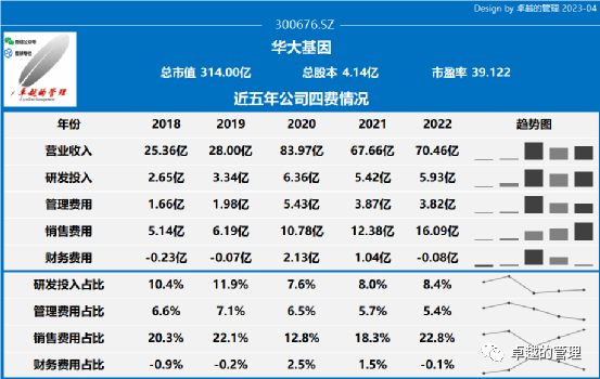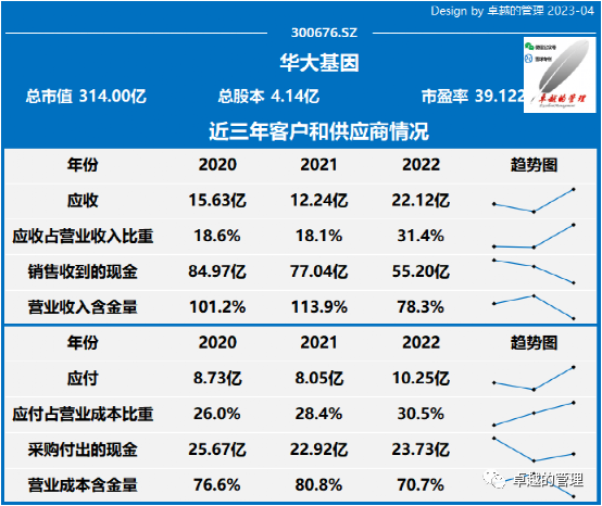2021-2026年全球基因测序前景预测(单位:亿美元) 1、生育健康基础研究和临床应用服务 主要业务包括一级预防:地中海贫血基因检测、扩展性携带者筛查、染色体异常检测、胚胎植入前遗传学检测;二级预防:无创产前基因检测、多种单基因病无创产前检测、NGS技术产前诊断、妊娠期并发症 筛查、孕期营养检测、孕期激素/生殖健康检测;三级预防:新生儿耳聋基因筛查、遗传代谢病筛查、新生儿疾病基因筛查;辅助诊断:单基因遗传病检测、全外显子检测、全基因组检测、用药安全指导等。 2、肿瘤防控及转化医学类服务 主要服务包括:遗传性肿瘤基因检测、HPV分型基因检测、DNA甲基化检测、肿瘤标志物测定、肿瘤个体化诊疗和用药指导基因检测、和肿瘤微小残留病灶(MRD)定制化检测等。 3、感染防控基础研究和临床应用服务 公司研发的PM Easy Lab 全自动核酸检测系统可一站式处理从核酸提取到检测出报告的全过程;并基于此平台开发的中枢神经系统感染病原体核酸多重检测产品、呼吸道病原体核酸多重检测产品以及细菌耐药基因多重检测产品,可为中枢神经系统感染和呼吸道感染患者提供快速的病原学检测结果和重点耐药基因检测结果,辅助临床用药,促进抗生素合理使用。 4、多组学大数据服务与合成业务 多组学大数据服务业务主要包含基因测序、质谱分析、生物数据库管理、数据云分析等标准化技术服务和全流程系统解决方案。合成类业务主要包含基因合成、Oligo合成等。其中,基因合成业务包括合成密码子优化过的cDNA、特殊位点突变的基因、人工设计的DNA序列,公司可提供包含目的基因的质粒;Oligo合成则是利用化学方法合成特定的已知序列的寡核苷酸片段,主要应用于反义寡聚核苷酸、测序与扩增的引物、DNA杂交、探针、点突变以及全基因合成等实验中。。 5、精准医学检测综合解决方案 二、核心竞争力分析 (一)严要求铸就资质体系,高质量引领行业标准 (二)依托实验室规模化和信息化优势,构建精准医学生态圈 (1)基因检测实验室规模和布局优势。 公司是目前世界上最大的医学基因检测中心之一,公司下属基因检测实验室共计31家,总面积约5.1万平方米,实验室已安全运行累计超过250万小时。截至报告期末,公司已经与全国上千家医疗机构开展合作,与各医疗机构开展合作的联合实验室超过400家。 (2)临床研究优势。 临床检测、疾病防治及生物制药的针对性和准确性需要大样本量数据的支撑,以便验证技术的可靠性,确定最佳防治策略。 (3)信息化平台核心优势 打造基因云计算平台,构建全业务场景、全生命周期的信息化交付系统,解决大数据多任务并行计算问题,精准匹配计算资源并保障数据安全;研发高性能基因序列分析加速工具集,为临床全基因组、病原微生物等检测提供高效解决方案 (三)体系化研发能力凸显协同效应,产品线布局广泛保障可持续发展 公司研发中心负责体外诊断产品的设计、研究与开发,下设免疫、分子、生化等部门,分别开展免疫、分子、生化等产品的研制,控股子公司脉示生物负责临床质谱产品的研发。 (1)生育健康类服务的研发与产品线优势 (2)肿瘤防控及转化医学类服务的研发与产品线优势 (3)感染防控类服务的研发与产品线优势 (4)多组学大数据服务与合成业务的研发与产品线优势 (5)精准医学检测综合解决方案的研发与产品线优势 (四)推进全球化战略布局,扎根“一带一路”国家 业务遍及全球100多个国家和地区,包括中国境内2,000多家科研机构和2,300多家医疗机构,其中三甲医院500多家;欧洲、美洲、亚太等地区合作的海外医疗和科研机构超过3,000家,与30多个国家和地区的卫生主管机构建立了合作关系。 (五)资本助推业务发展,产业投资构建行业“生态圈” (六)汇聚全球行业精英,提升人才竞争力 三、营业收入与营业成本分析 报告期内,公司实现营业收入70.46亿元,同比上升 4.1%;实现归属于上市公司股东的净利润8.03亿元,同比下降 45.1%。报告期内,公司继续加大研发投入力度,研发投入总金额为 59,267.42 万元,同比增长 8.4%。公司的毛利润仅下降了6.1%,但是净利润下降了45.1%,需要看一下四费情况,确定其原因所在。 查看公司近三年业绩情况,新冠爆发次年(2020年),华大基因积极参与抗疫,2020年的营收增幅达到了近200%,2021年明显回落,2022年比2021年营收有所增长,但是近两年的毛利和净利都明显下降。2022年的净利润率仅为8.4%。而且更为糟糕的是净利含金量持续下降,2022年的净利含金量只有17%,也就是说虽然赚了钱,但是钱几乎都没有收回来。而公司年报只是说“主要系报告期销售商品、提供劳务收到的现金减少所致”,并没有过多的解释,所以我们还需要看客户和供应商关系。 细看主营业务构成,其中占比最大,毛利率最高的精准医学检测综合解决方案,营收连续三年持续下降,比例从66.5%降低到了35.5%。可见该业务主要的营收包含了新冠检测(公共卫生疾控的“火眼”实验室一体化综合解决方案),而国内新冠检测的持续减少,业务量必然下降。疫情后期,公司需要将“火眼”实验室向常规核心业务转化。 感染防控基础研究和临床应用服务近三年营业收入有明显的上升,只是其毛利率相对精准医学检测综合解决方案低了一些,传染病检测确实也是一直存在的常规业务(除了新冠以外),也可能是公司后续业务量增长的