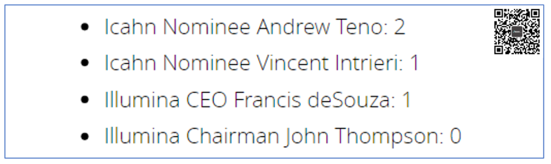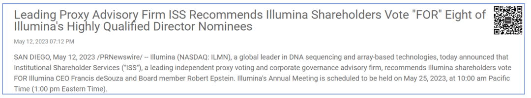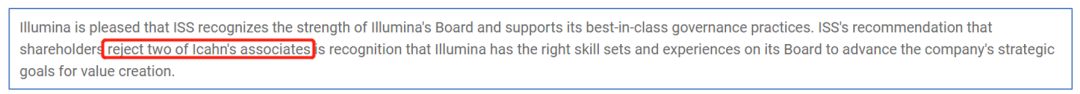 各位股东,大家早上好中午好下午好晚上好。 今天不发财报的内容,累了,又没人看。 朋友们,我很失望。 业内媒体竟然对Illumina这场董事会争夺战没有给予足够的关心,连这么大的事都没见到报道。 唉,真的只有我这样的Illumina真爱粉才关心么? 部分的真相 2023年5月12日,Illumina发布了一份新闻稿,其中的标题如上图所示。 意思就是一个组织叫ISS,提议大家投票给Illumina提名的8位董事。 如果只看这个标题,第一印象就是ISS这家机构是支持Illumina的。 然而,如果大家稍微回忆下之前Illumina的提名人选就会发现,事实并不是这样。 在2023年4月20日的新闻稿中,Illumina呼吁大家给9位提名人投票。 也就是说ISS只认可Illumina提名中的9位。 而仔细看新闻稿会发现,不仅仅如此。 也就是说,ISS建议拒绝Icahn的2位提名人。 我们换个说法,ISS建议投票给Icahn 3位提名人中的1位,而拒绝另外两位。 这种玩弄语言的游戏也是让人直呼Illumina内行,他真的,我哭死。 那么,哪位Illumina的提名人没有得到ISS的背书,而又是哪位Icahn的提名人得到了ISS的支持呢? 全部的真相 秉承着寻找消息源头的原则,特意翻了翻ISS的网站,很不幸,并没有找到。 就在我绝望之际,忽然想到,这事,还得看Icahn老兄的。 2023年5月15日,Carl Icahn发表了第11封关于Illumina的公开信。 在公开信中,Icahn总结了ISS和Glass Lewis两大机构对于两大阵营提名人的推荐情况。 结合路透社、彭博社等媒体的信息交叉验证,我们可以得出结论: 第一,两大机构均不支持Illumina现任董事长 John Thompson; 第二,两大机构均支持Icahn的提名人Andrew Tendo加入董事会; 第三,Glass Lewis支持替换Illumina CEO Francis deSouza; 对不起,另外一个Icahn的提名人,你不太重要(狗头)。 这里面还有一个信息,那就是Glass Lewis是在2023年5月10日发表的报告,Illumina对此事只字未提。 也可以理解,毕竟CEO和董事长你都不支持人家,提才是不正常的。 至于Glass Lewis为啥不支持他俩,其给出的原因恰恰就是之前Ichan提到的二人之前长久的特殊亲密关系(不要无关联想,可以参考前面几期)。 董事长易位? 如果ISS和Glass Lewis的建议得到广泛的接纳,那么这就意味着现任董事长John Wendell Thompson大位即将不保。 John W. Thompson 出生于1949年4月24日,新泽西 Fort Dix人。 后面的故事我们差不多算是耳熟能详了,比如他执掌Symantec,担任Microsoft董事啦。 但是,根据维基百科的爆料,还不仅仅只有这些。 Thompson曾经帮助奥巴马在2008年的总统竞选,有消息显示奥巴马曾经考虑Thompson担任商务部部长。 所以你猜猜为什么Illumina Forum能邀请比尔盖茨和奥巴马来演讲? 不管海内外,都是人情世故啊,朋友。 也就是现在,Thompson后面的大佬纷纷退居二线,不然你以为Icahn为啥敢挑战他呢? 最后 Illumina是全体股东的Illumina,因此,这并不算是黑Illumina,希望各位能够明白。 在经历这么多年高速发展之后,Illumina迎来了瓶颈期。 这给我们一个启示,那就是科技型企业,如果不能在技术鼎盛期及时升级技术水平,那么,就会面临这种尴尬的境地。 当然,现在还不是最坏的时候。 哦,对了,公开信和Illumina的新闻稿有兴趣的朋友可以自行查看注释的链接。 反正,我是看不下去那些车轱辘话。 (完) |