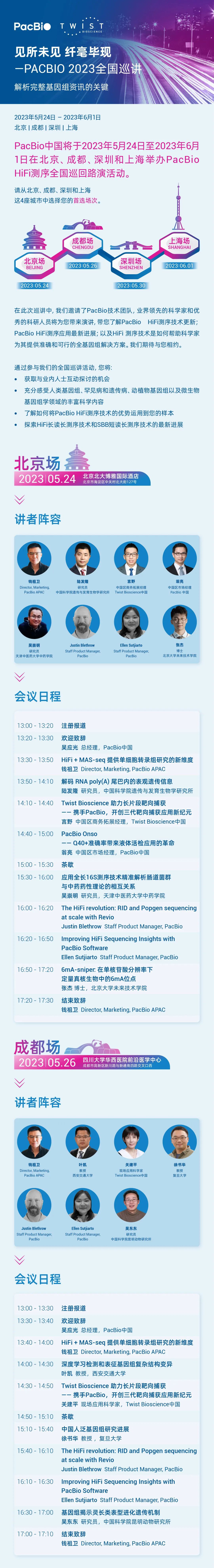 PacBio中国将携手我们的战略合作伙伴 Twist Bioscience中国 于2023年5月24日至2023年6月1日在北京、成都、深圳和上海举办PacBio HiFi测序全国巡回路演活动。 5月24日 北京 - 北大博雅国际酒店 5月26日 成都 - 四川大学华西医院前沿医学中心 5月30日 深圳 - 深圳湾实验室 6月01日 上海 - 上海交通大学Bio-X研究院 请从北京、成都、深圳和上海这4座城市中选择您的首选场次!Roadshow现场席位有限,我们将通过邮件与您取得联系,为您锁定线下席位。PacBio中国诚邀您莅临现场与我们交流探讨! |