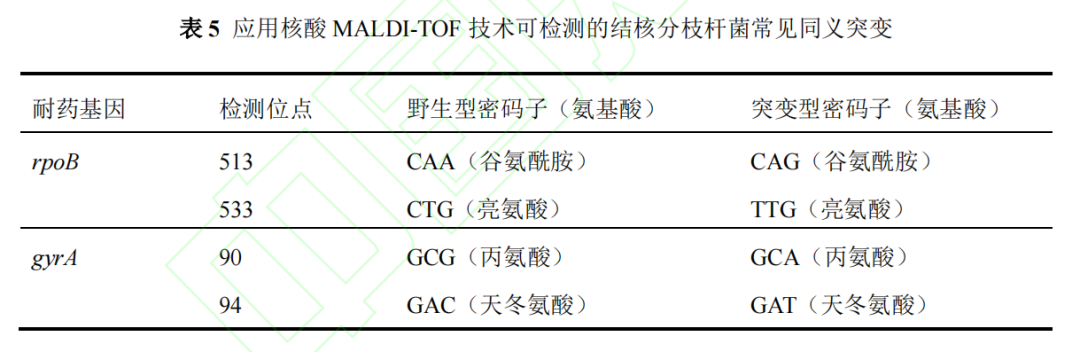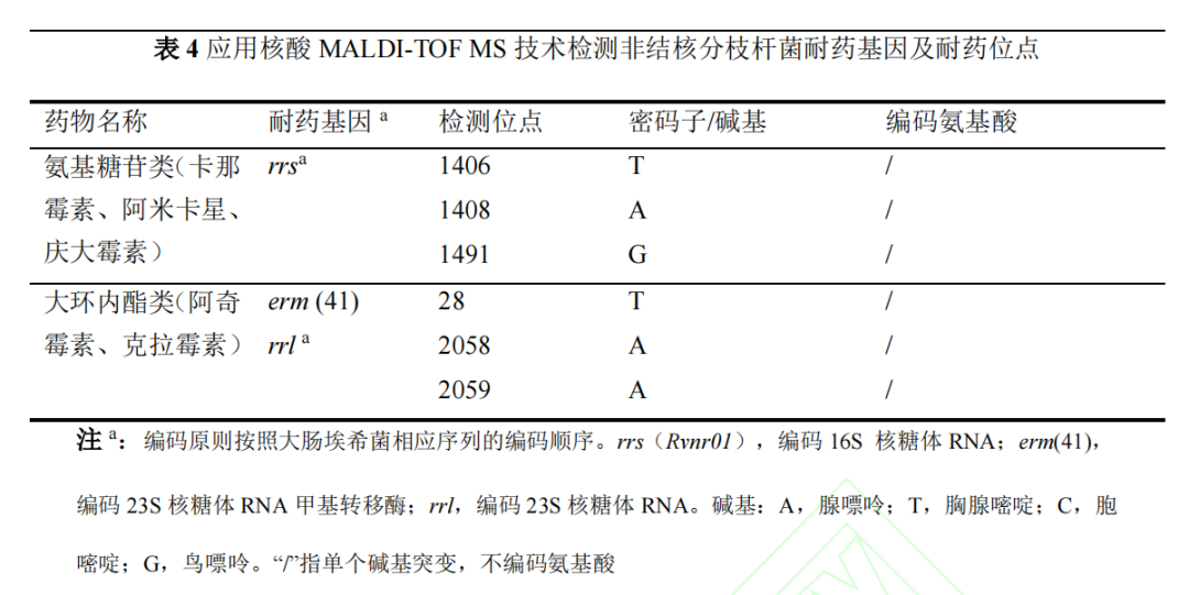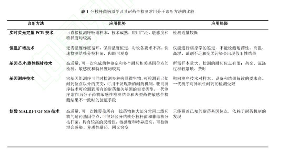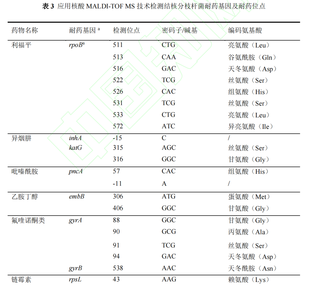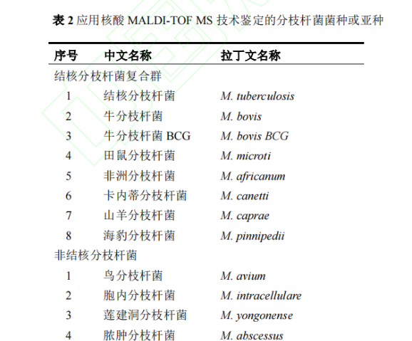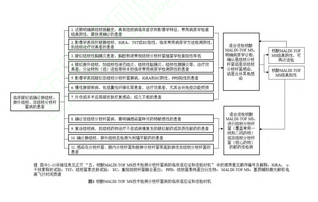 文章来源:《中国防痨杂志》网络首发论文 作者:梁建琴,吴雪琼,安慧茹 DOI:10.19982/j.issn.1000-6621.20230113 摘要 核酸基质辅助激光解吸电离飞行时间质谱(matrix-assisted laser desorption ionization–time of flight mass spectrometry,MALDI-TOF MS)技术在结核病与非结核分枝杆菌病病原学和耐药性诊断中的应用越来越多,为早期诊断、鉴别诊断和耐药鉴定提供了快速、准确的依据。然而,在实际应用中,临床医生对标本的选择、留取、送检时机及注意事项、报告结果的解读等的理解和掌握参差不齐,尚需规范化。本共识总结了核酸MALDI-TOF MS检测技术应用于结核病和非结核分枝杆菌病诊断的临床适应证和标本采集注意事项,介绍了如何正确解读核酸MALDI-TOF MS技术鉴定分枝杆菌菌种和耐药性的报告结果,以进一步规范核酸MALDI-TOF MS技术在结核病和非结核分枝杆菌病诊断中的临床应用,提高临床诊断水平,指导临床开展早期精准有效的治疗。 第一部分 核酸基质辅助激光解吸电离飞行时间质谱技术 基本原理与特点 第二部分 共识制定的过程 第三部分 核酸MALDI-TOF MS技术鉴定分枝杆菌菌种 及其耐药性 目前,核酸MALDI-TOF MS技术可鉴定结核分枝杆菌复合群8个亚种和40个NTM菌种及其亚种,合计48个分枝杆菌菌种和亚种(表2),几乎覆盖了临床上分枝杆菌病的所有常见致病菌,可以满足临床实现快速鉴定分枝杆菌菌种的要求,为临床医务人员提供诊断参考。另外,随着临床实践的逐步积累,核酸MALDI-TOF MS技术可根据临床上未来可能出现的菌种予以增加鉴定。 第四部分 应用核酸 MALDI-TOF MS 技术检测分枝杆菌病 的临床适应证和送检时机 推荐意见1:近期具有明确的肺结核密切接触史,咳嗽、咳痰超过2周,伴或不伴有咯血、胸痛、胸闷、气短等呼吸道症状和低热、盗汗、乏力、体质量减轻等全身中毒症状,临床常用结核病病原学检查结果为阴性,影像学检查存在肺部病变,需快速确诊的患者,建议送痰和支气管肺泡灌洗液进行培养的同时送核酸MALDI-TOF MS检测,可在1~2 d内快速鉴定病原菌以明确诊断。 推荐意见2:胸部影像学表现高度怀疑肺结核,γ-干扰素释放试验(interferon-gamma release assays,IGRA)阳性,结核菌素皮肤试验(tuberculin skin test,TST)强阳性或重组结核杆菌融合蛋白(EC;宜卡®)阳性,临床常用病原学检测阴性,诊断性抗结核治疗效果差,适合送MALDI-TOF MS检测,可快速明确诊断。 推荐意见3:疑似结核性胸膜炎患者,胸腔积液常规结核分枝杆菌细菌学检查阳性率低,建议按要求送胸腔积液进行核酸MALDI-TOF MS检测以提高病原学检出率。 推荐意见4:疑似肺外结核,如结核性脑膜炎、结核性淋巴结炎、骨关节结核、肠结核、结核性腹膜炎、泌尿生殖系统结核、结核性心包炎、皮肤结核等肺外结核患者,治疗效果差,分泌物和(或)活检、手术组织临床常用病原学检测阴性时,适合送核酸MALDI-TOF MS检测。 推荐意见5:胸部影像学表现高度疑似NTM肺病,尤其是IGRA阴性和EC皮肤试验阴性,TST阳性者,适合及早送痰和(或)支气管肺泡灌洗液进行核酸MALDI-TOF MS检测。 推荐意见6:慢性肺部疾病,包括肺囊性纤维化、支气管扩张、慢性阻塞性肺疾病、尘肺、肺间质纤维化、支气管哮喘、过敏性肺炎、变应性支气管肺曲霉菌病等患者,经规范性治疗效果差,尤其合并免疫功能受损,如艾滋病病毒(human immunodeficiency virus,HIV)感染/艾滋病(acquired immune deficiency syndrome,AIDS)和器官移植等长期服用免疫抑制剂的患者,高度怀疑并发肺结核或NTM肺病时,适合送核酸MALDI-TOF MS,以快速鉴定病原菌及其耐药性。 推荐意见7:对外伤或手术,包括医疗美容手术后出现局部皮肤反复感染,伤口经久不愈的患者,建议送伤口分泌物进行核酸MALDI-TOF MS,排除NTM感染。 推荐意见8:确诊NTM病,包括NTM肺病和肺外NTM病的患者,需要明确感染菌种对药物的敏感性,可进行核酸MALDI-TOF MS检测。 推荐意见9:复治肺结核和肺外结核,抗结核药物治疗效果不佳或者病情复发,高度怀疑耐药的患者,进行痰、分泌物、活检及手术组织表型和基因型药敏试验的同时,可送核酸MALDI-TOF MS进行耐药性检测;高度怀疑异质性耐药者,可在治疗过程中进行核酸MALDI-TOF MS耐药性检测跟踪。 推荐意见10:肺结核和肺外结核诊断明确,痰、分泌物和(或)活检、手术组织GeneXpert MTB/RIF检测利福平耐药的患者,建议送核酸MALDI-TOF MS检测结核分枝杆菌对其他一线和二线抗结核药物的耐药性。 推荐意见11:对于鸟分枝杆菌、胞内分枝杆菌和脓肿分枝杆菌等致病性NTM,建议送核酸MALDI-TOF MS进行耐药性检测;对于弱致病性的NTM,可根据送检样本来源、临床症状和影像学表现,决定是否进行核酸MALDI-TOF MS检测其耐药性。 第五部分 标本的采集、运输、检测及实验室质量控制、 出具报告 1.采集标本容器:收集临床标本的容器内需含有分枝杆菌灭活剂成分。 2.采集标本信息:收集标本的容器上应标注患者信息、标本类型、送检科室等信息。送检标本应有送检申请表,填写受检者信息,包括编码、采样日期、个人基本信息、标本类型、采样单位等。采样人员在采样前及采样后均需仔细核对受检者信息。 4.采集标本时:不同类型的生物标本采集,必须由经过培训且考核合格的专业人员进行规范操作,严格执行无菌操作,避免标本污染;对高度怀疑分枝杆菌病者,建议送检2份以上同类型或不同类型的样本;其他肺外结核样本最好采集自病灶处;呼吸道样本